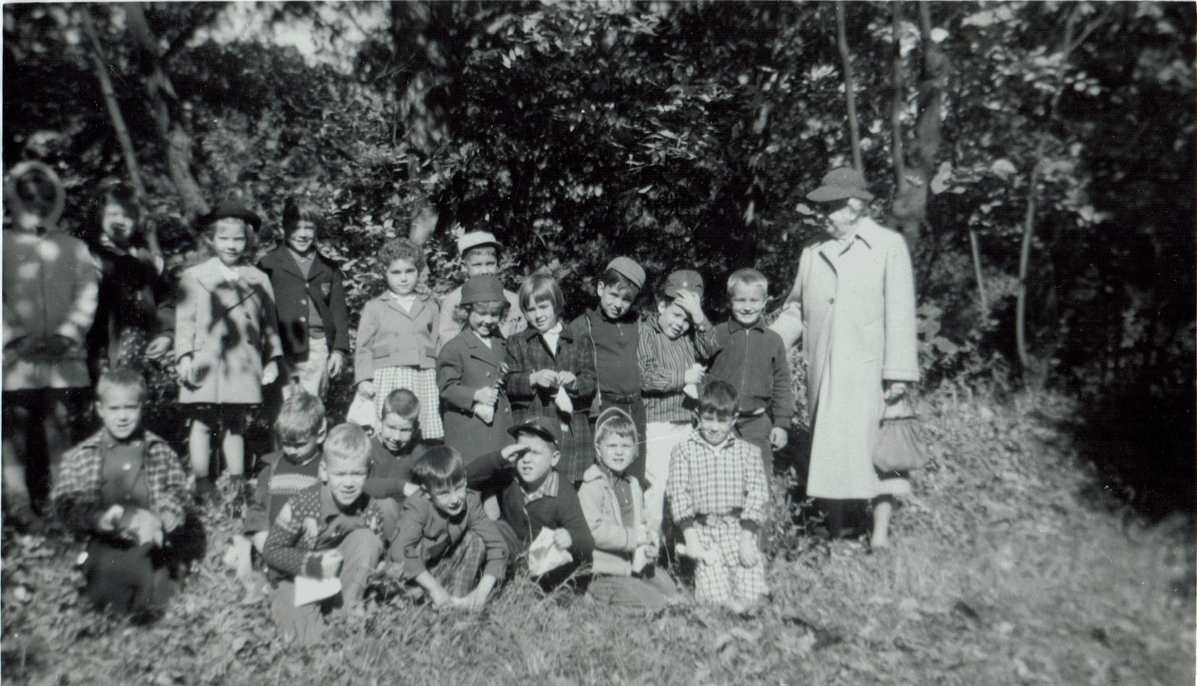 Photograph of Cora Hartshorn at the Arboretum with school children. Undated.Acquisition