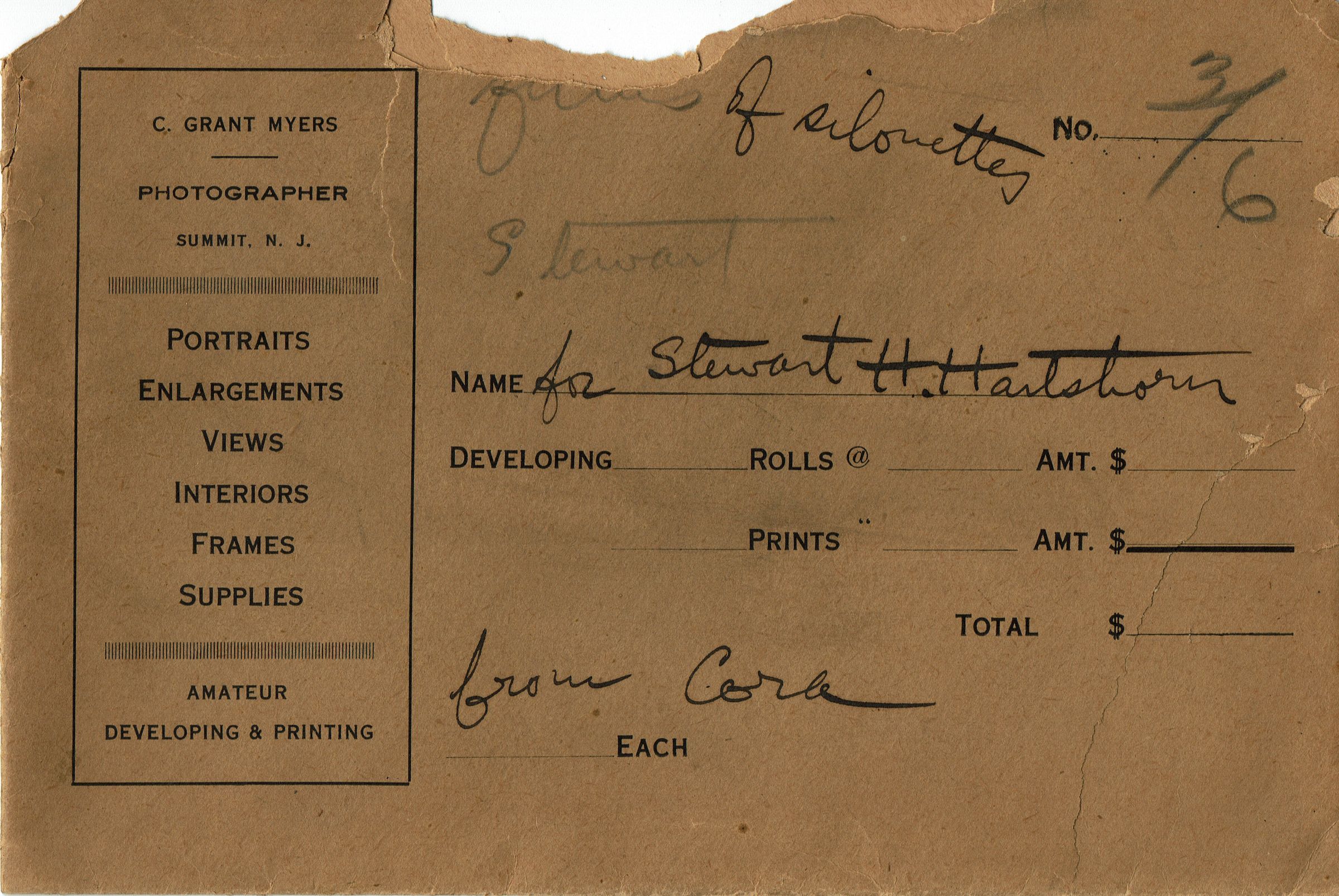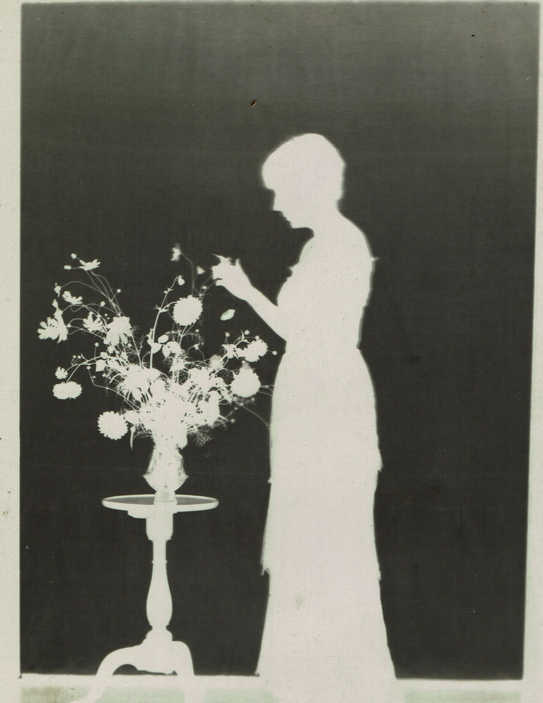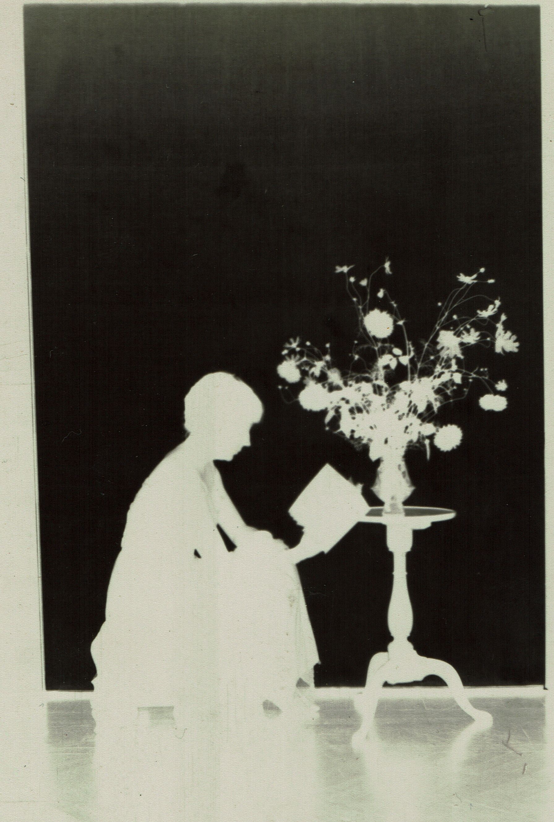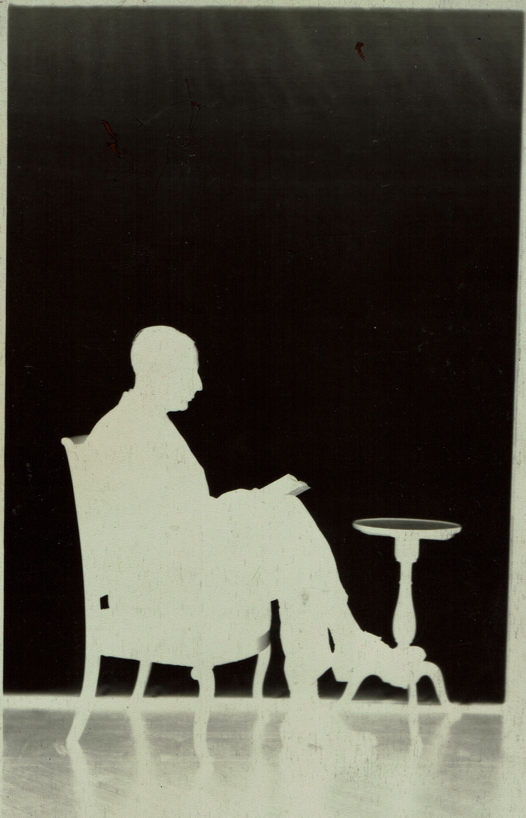 Series of photographic negatives of silhouette pictures made by Cora Hartshorn in summer 1914. Cora made around 100 photo silhouettes during the time she was recovering from illness. The negatives were in an envelope that reads" For Stewart H. Hartshorn from Cora" Films of silouettes (sic). The silhouettes consist of three images of female figures seated or standing near a table with flowers, 4 images of males seated and one child seated.Photograph Details