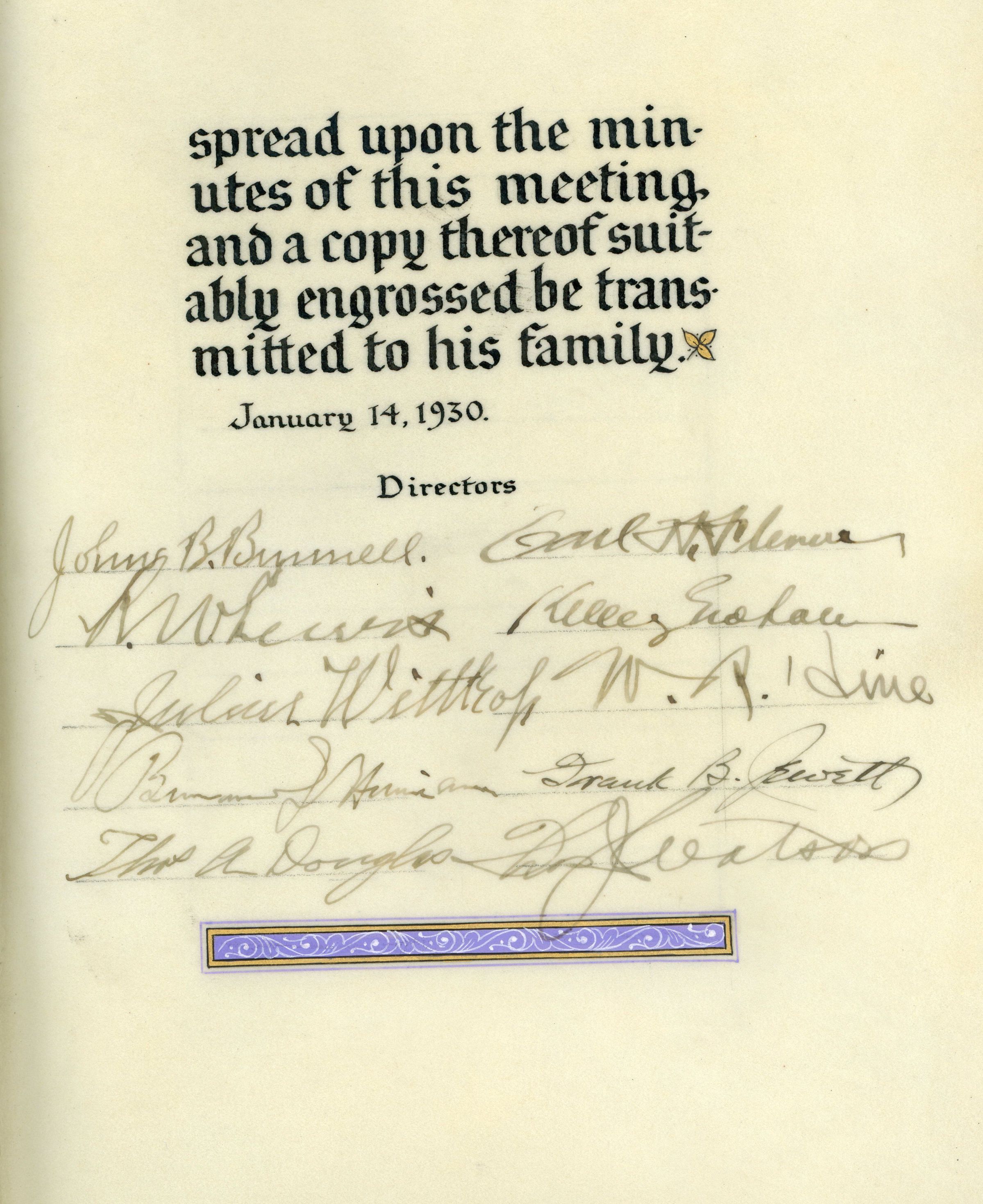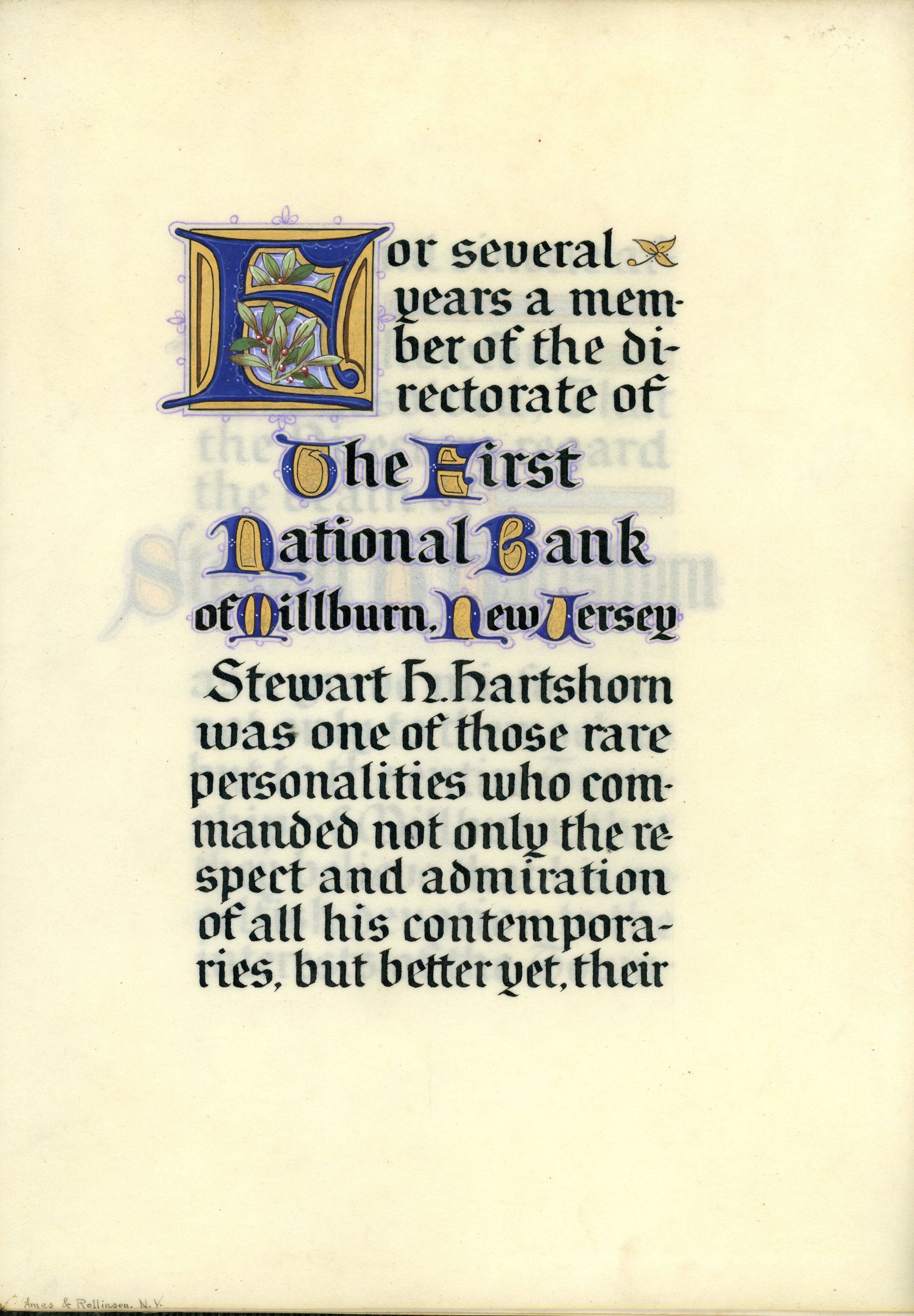Leather bound resolution from the First National Bank of Millburn dated January 14, 1930, honoring Stewart Henry Hartshorn at the time of his death. 5 pages, illuminated script on parchment paper. Signed by the Board of Directors.Acquisition