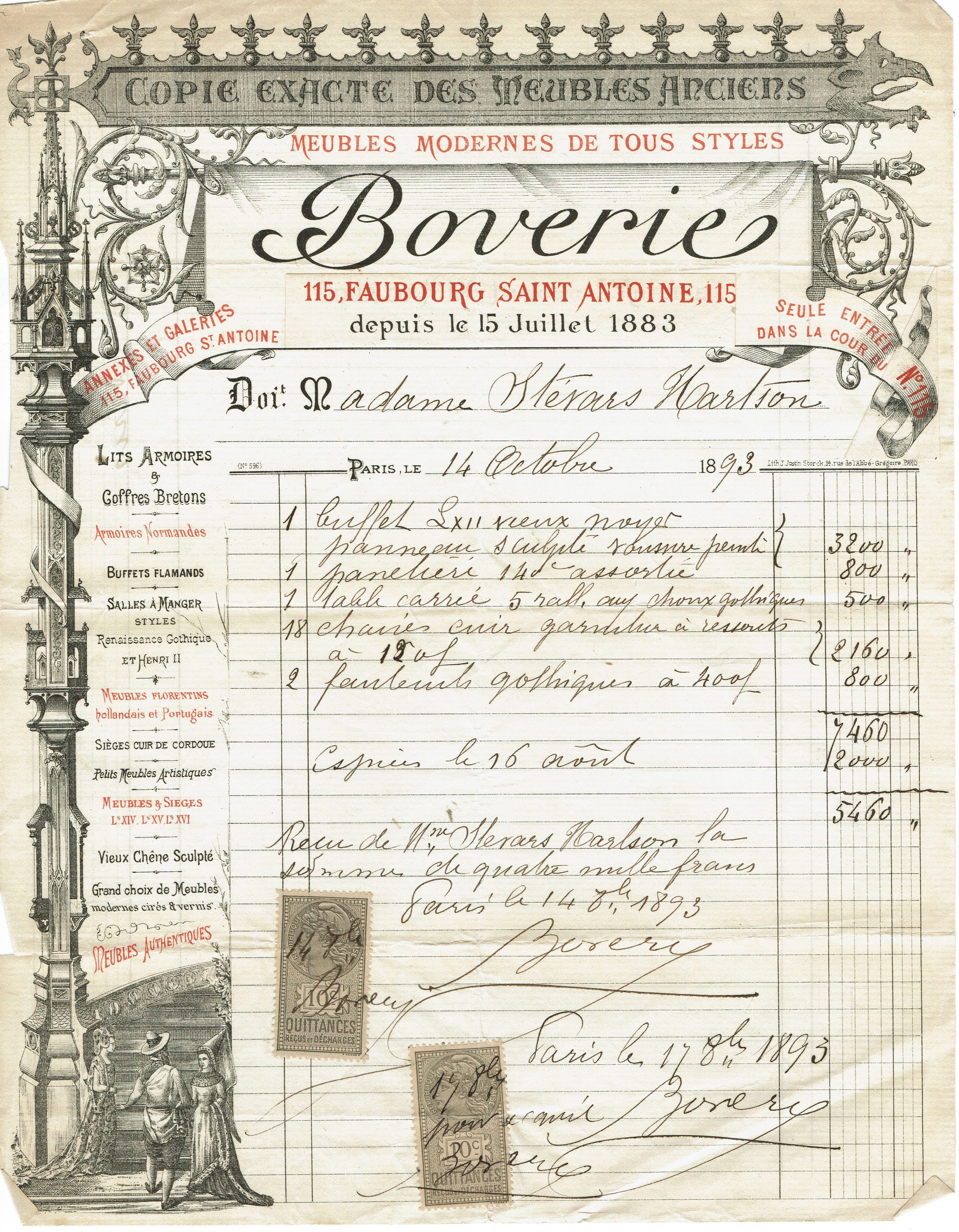 Receipt for furniture purchased by Joanna Hartshorn at Boverie, Paris on October 14, 1893. Boverie was a furniture store established in 1883, which featured modern reproductions of antique furniture as well as antique furnishings. According to the receipt, they featured pieces in Renaissance and Gothic styles, styles of Louis XIV-XVIAcquisition