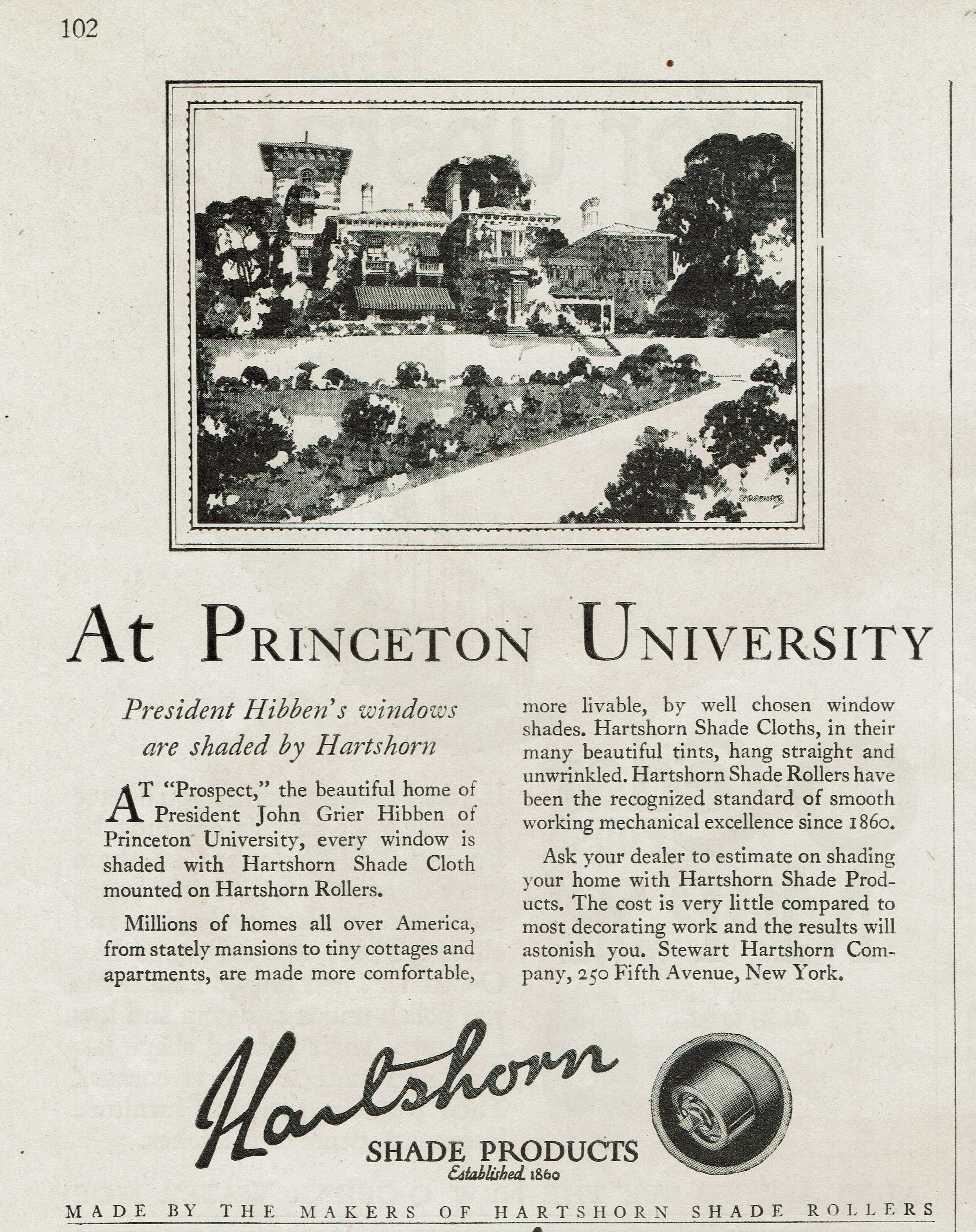 Advertisement for Hartshorn Roller Shades highlighting the use of Hartshorn Shade Cloth mounted on Hartshorn rollers in in every window of Princeton University President John Grier Hibben's home "Prospect." Clipping from unknown magazine. Undated.Acquisition