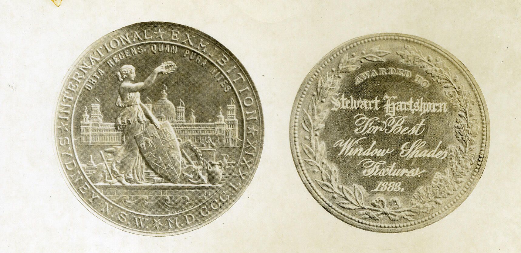 Photograph of medal awarded to Stewart Hartshorn for Best Window Shades Fixtures at the 1888 International Exposition in Sydney, New South Wales.Collection