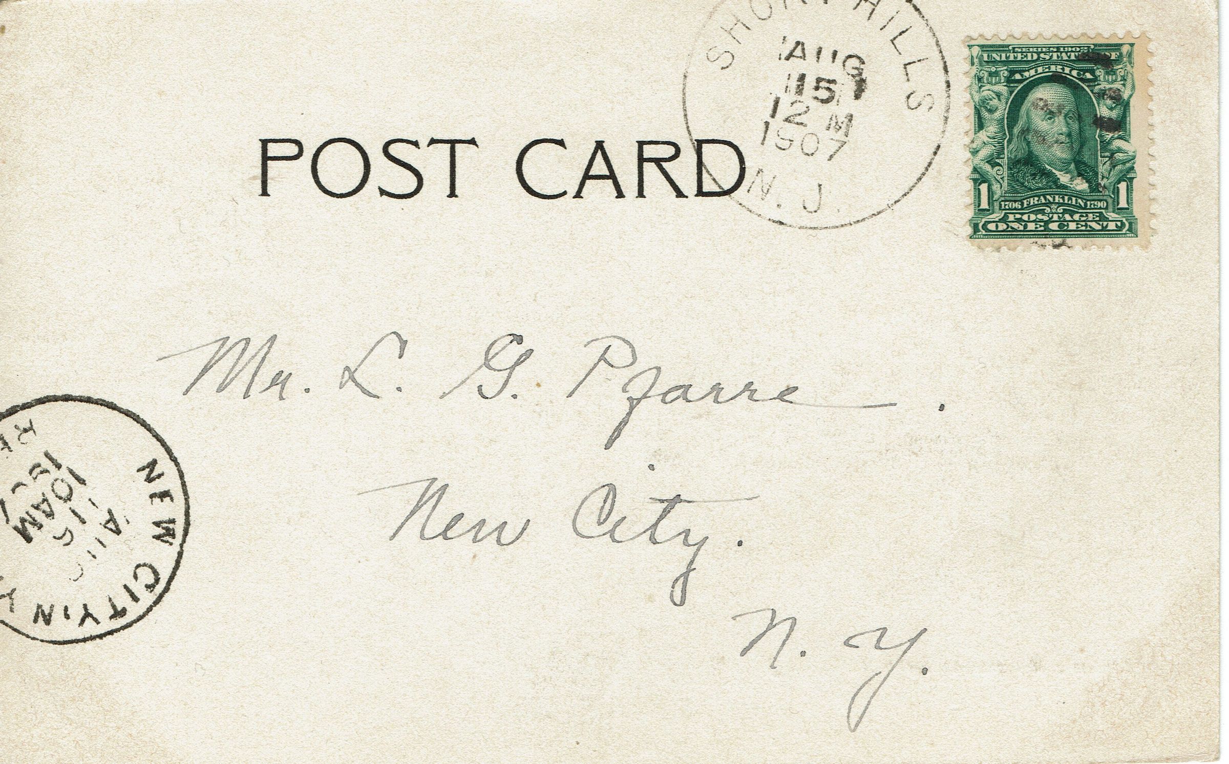 Postally used photographic postcard of Hartshorn's Reservoir, Short Hills. Postmarked Short Hills, August 15, 1907, 12 M, received New City, New York, August 16, 1907, 10 am. Card is addressed to Mr. L.G. Pfarre, New City, New York. Message on front reads: "Many happy returns of the day? Emma."Collection