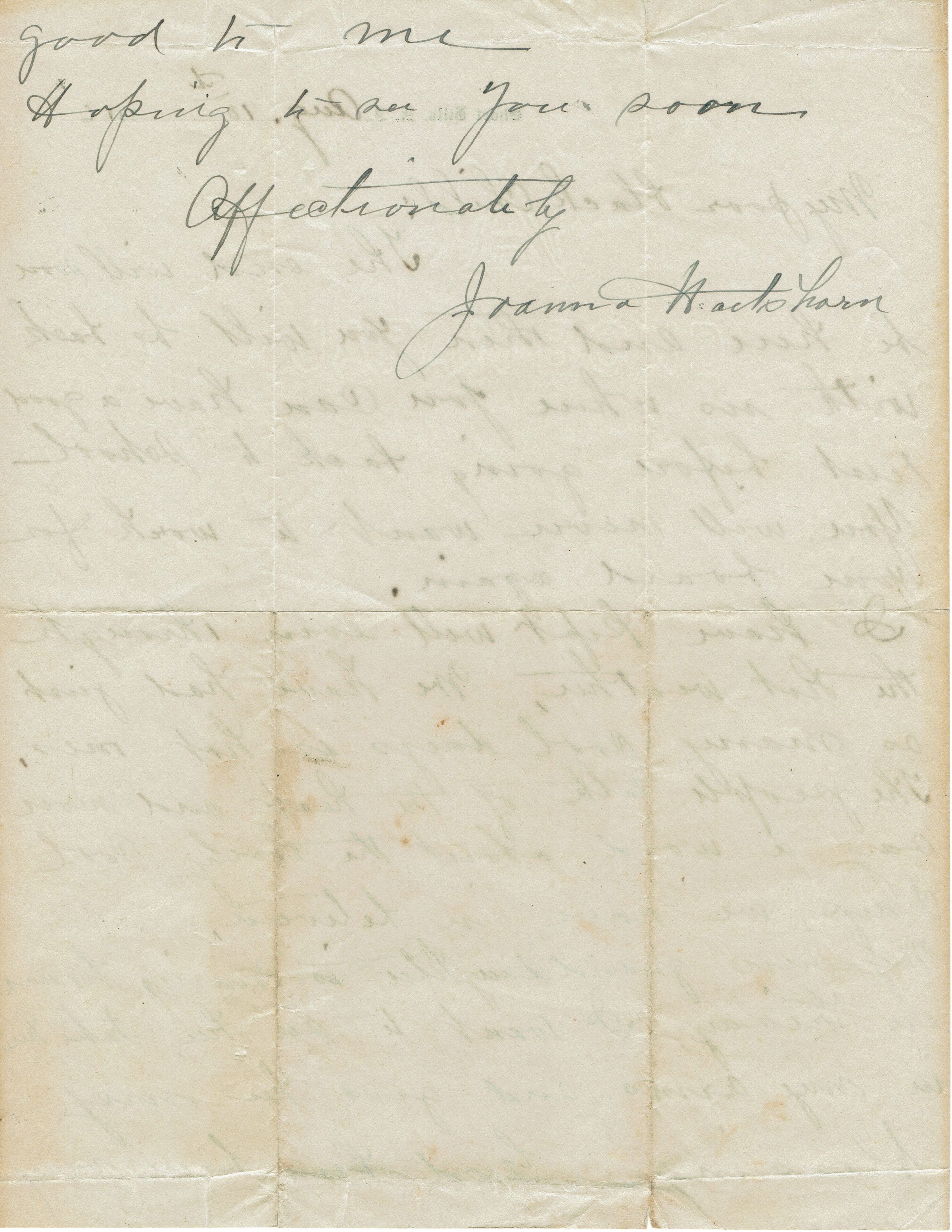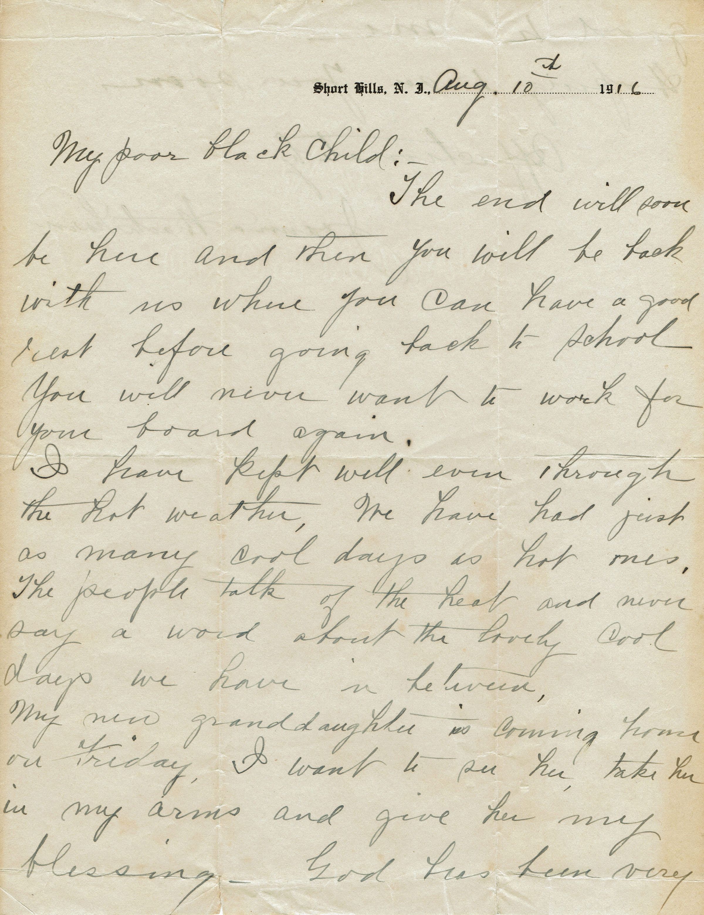 Letter from Joanna Hartshorn dated August 10, 1916 to "My poor black child" describing the child coming back to live with them and not having to work for board again. Joanna also mentions the birth of her granddaughter (Catherine Jennette).Acquisition