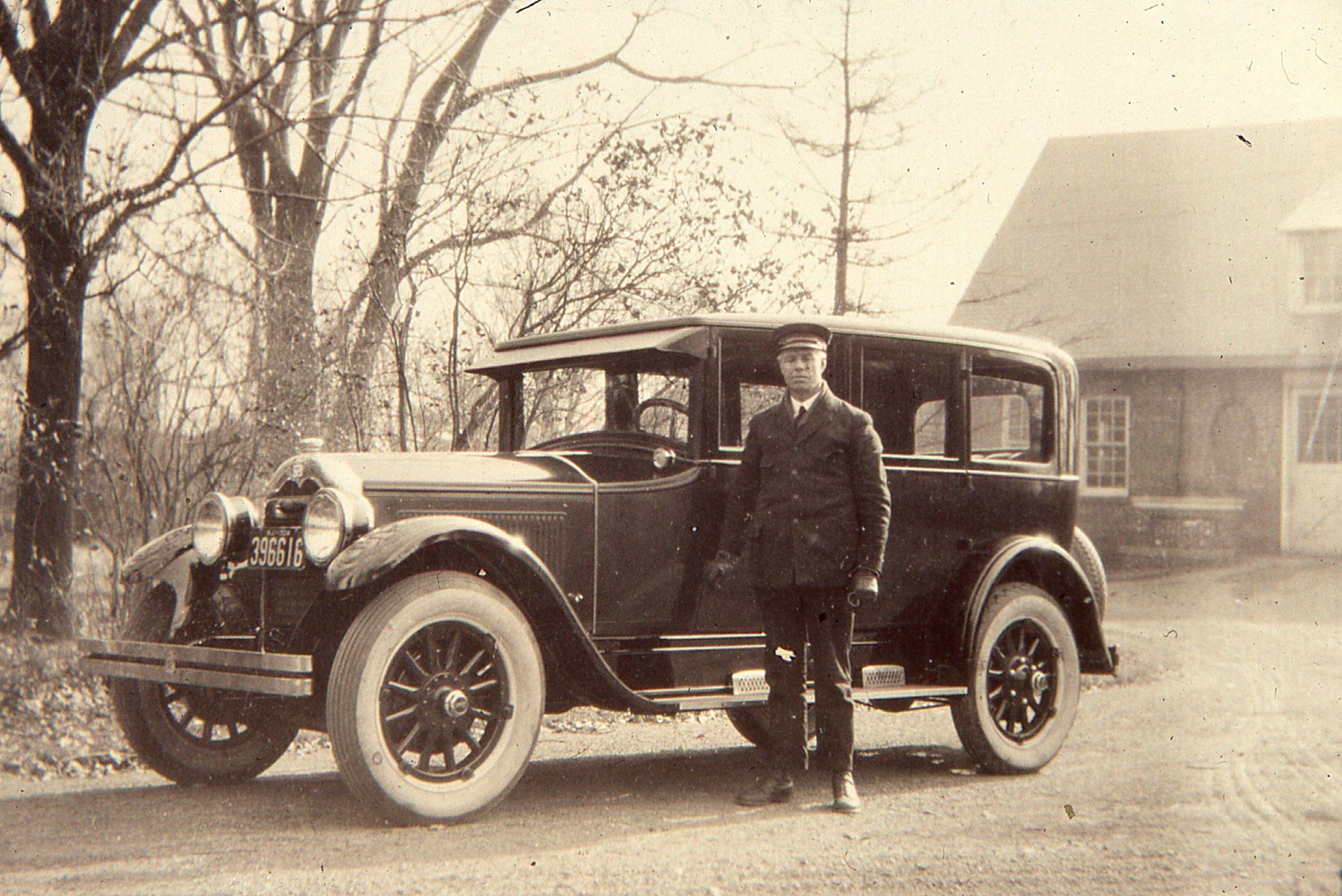 Photograph of Joseph A. Collins (1873-1958), who was chauffeur to the Hartshorn family, at the Hartshorn garage with the family's 1926 Buick..Photograph Details