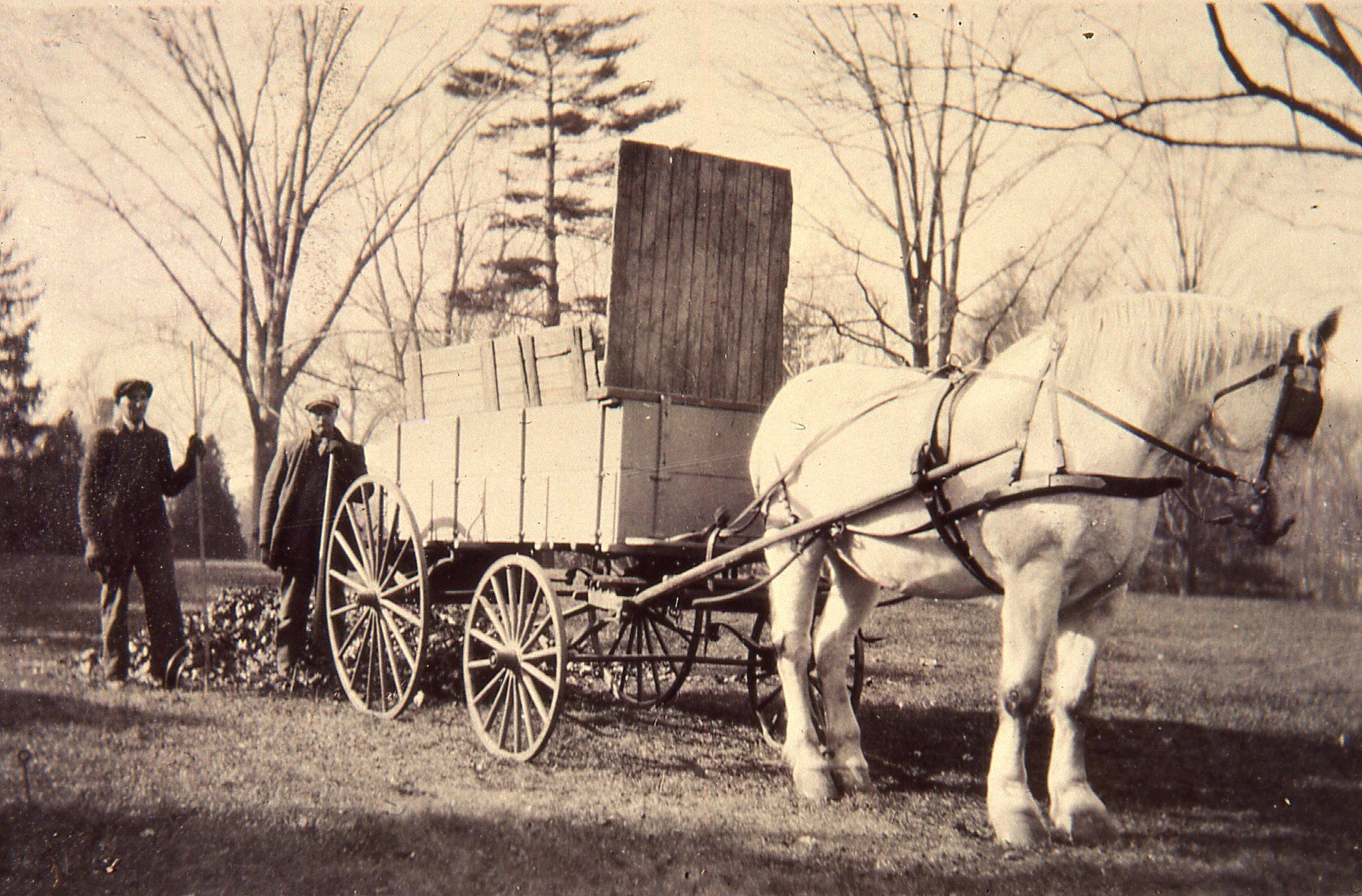 Photograph of two men behind a leaf cart from Tom Collins, the source of the image.Photograph Details