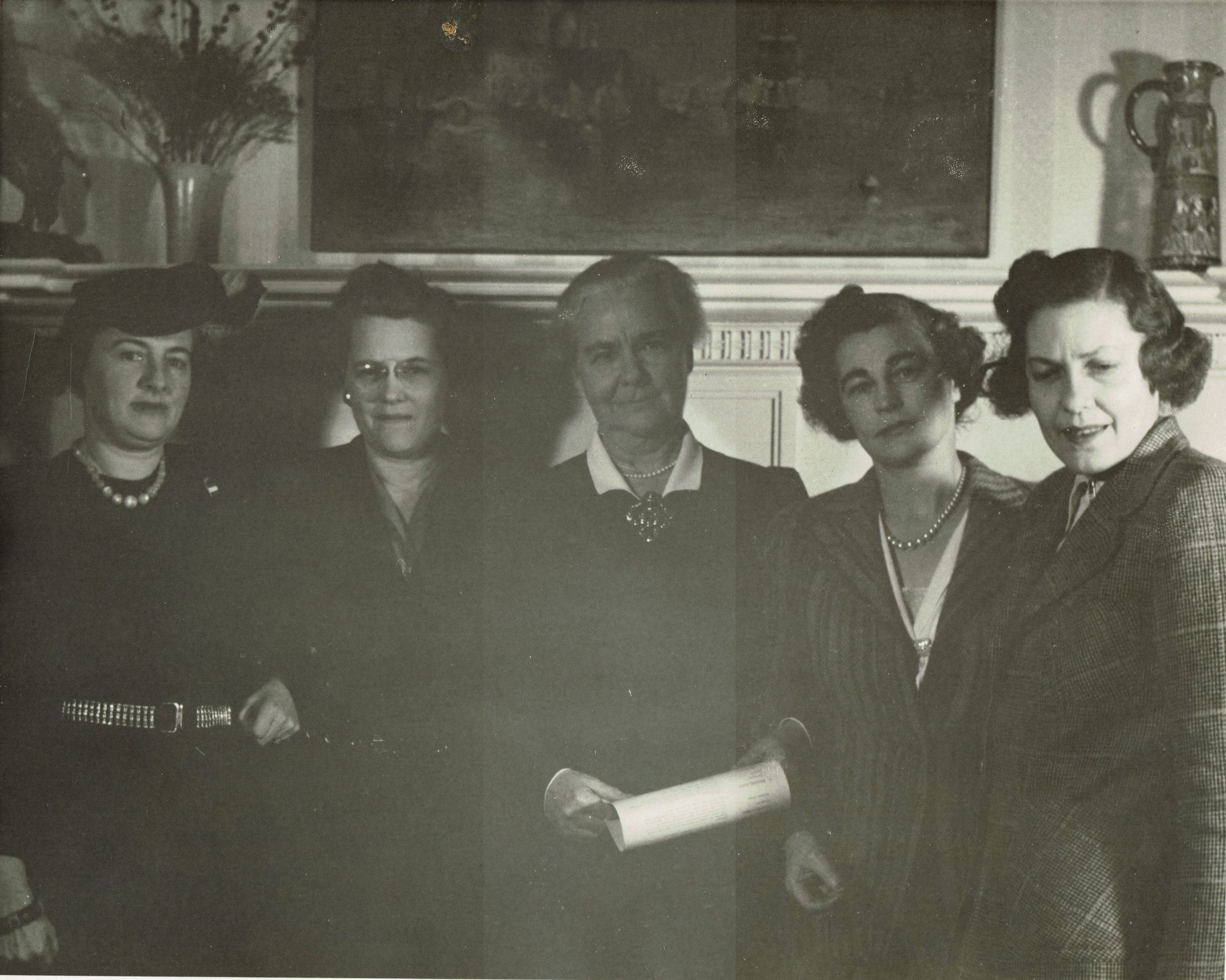 Group photograph from February 1943 of: (left to right) Mrs. George Decker, Mrs. Harold Ressler, Mrs. Stewart Hartshorn, Mrs James Synnington, Mrs. Robert Veit.Collection
