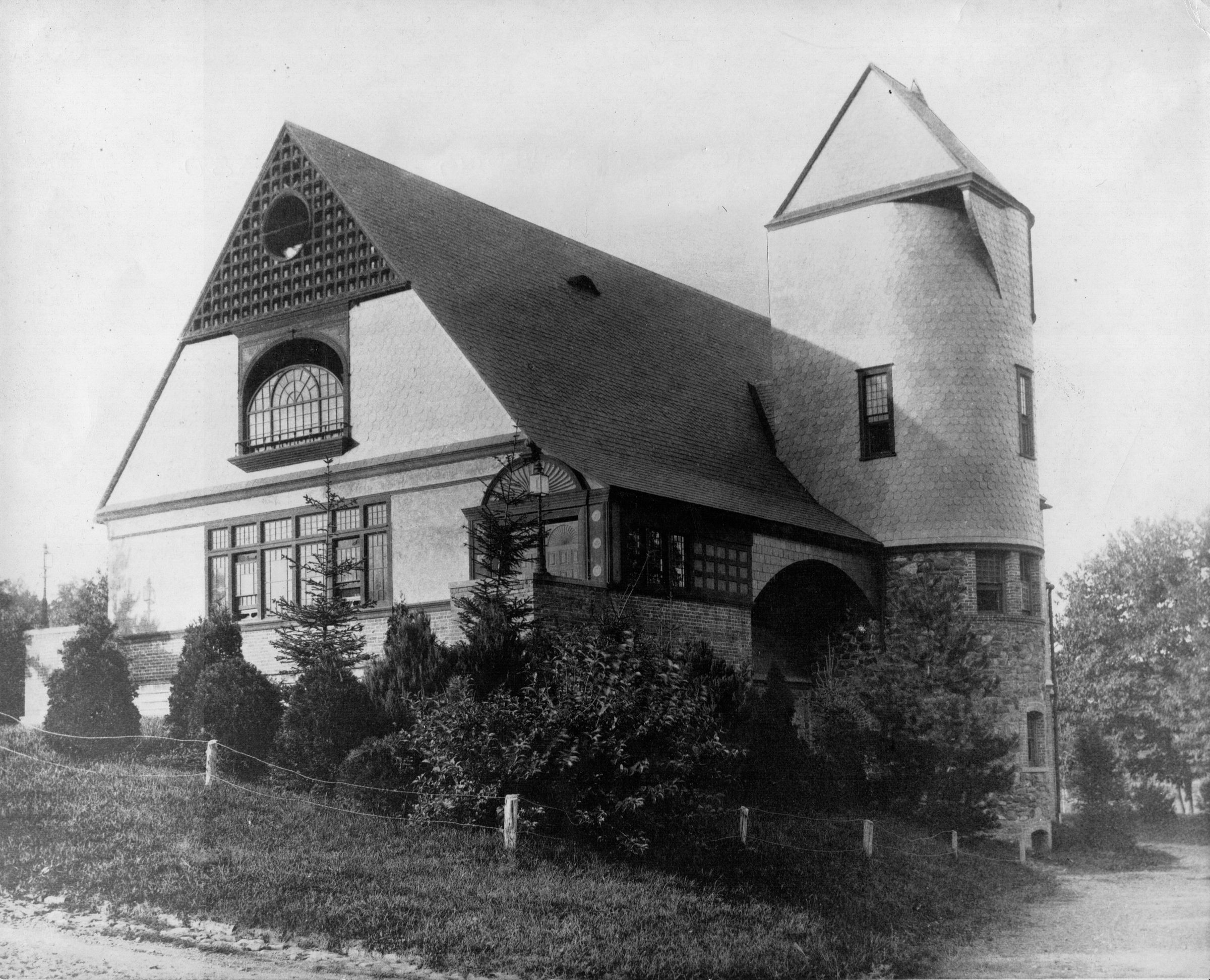 Stewart Hartshorn commissioned the building from Stanford White of McKim, Mead & White to serve as a hall for his fledging "ideal community. The design is based on White's admiration of the rustic cottages of Brittany, with its wooden structure, gabled roof and round tower. The building was completed in the summer of 1880 and served many functions. It was an early meeting place for the Christ Church congregation (prior to the construction of the church in 1883. It also served as the first home of the Short Hills Day School. In 1946, the Racquet's Club of Short Hills purchased the building and adjacent tennis courts from the Hartshorn Estate. The Racquets Club burned down in a major fire in February 1978.Acquisition