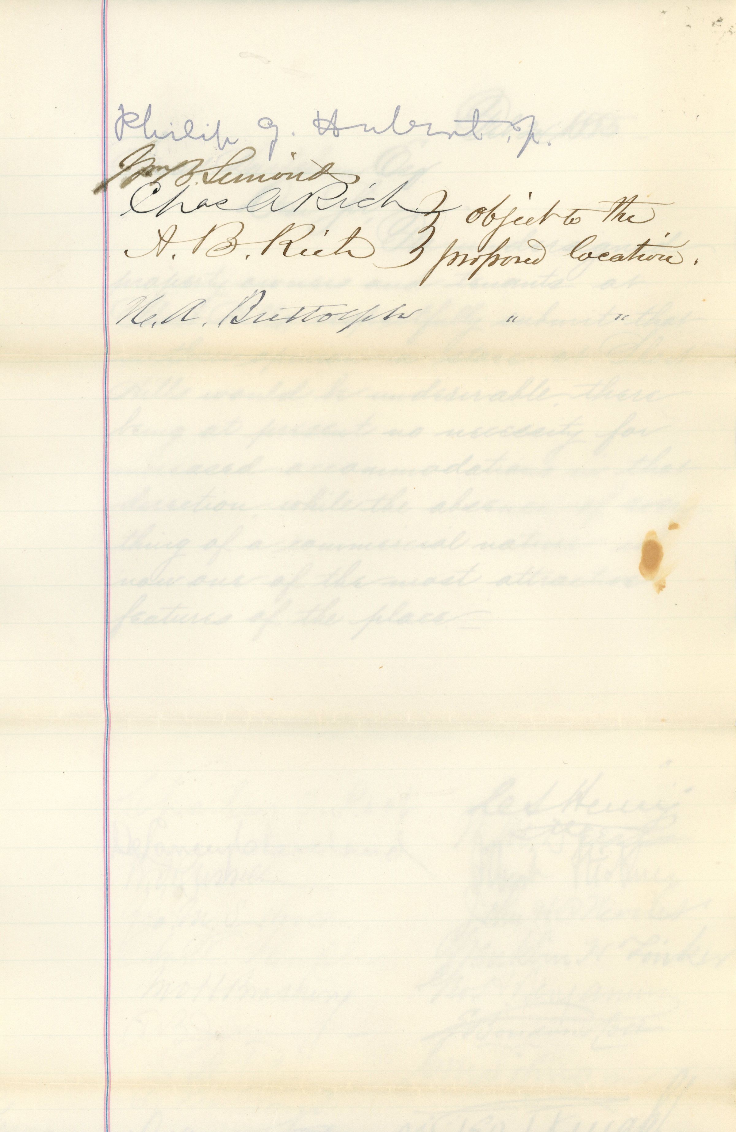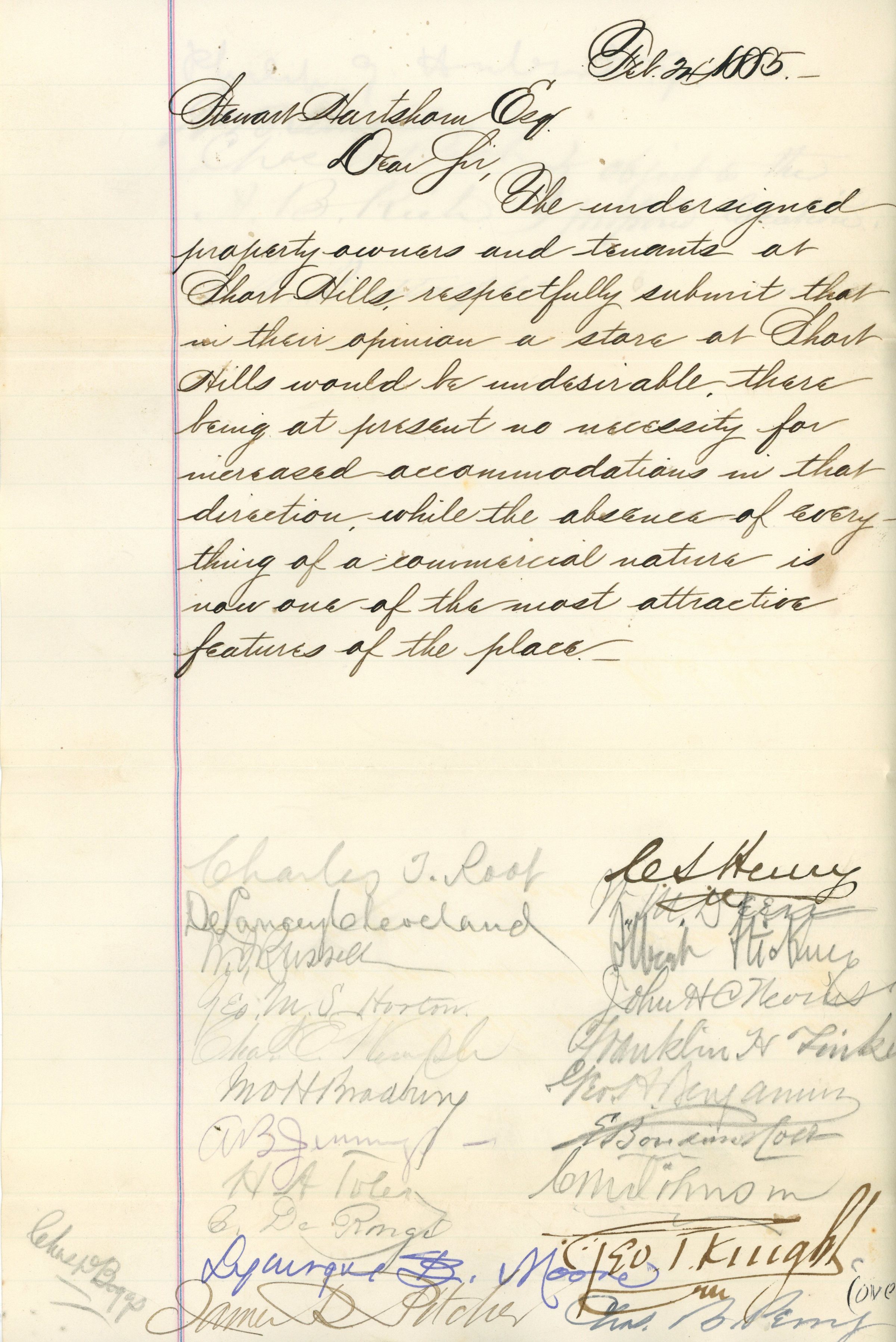 Two page handwritten petition addressed to Stewart Hartshorn Esq. and dated February 24, 1888 objecting to the proposal of putting a store in Short Hills. The peition contains 27 signatures, the last two (Charles Rich and A.B. Rich) objecting to the proposed location.Acquisition