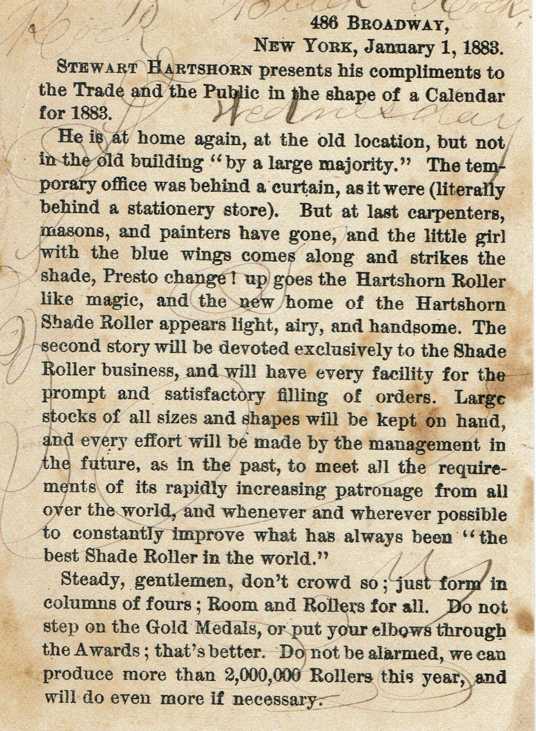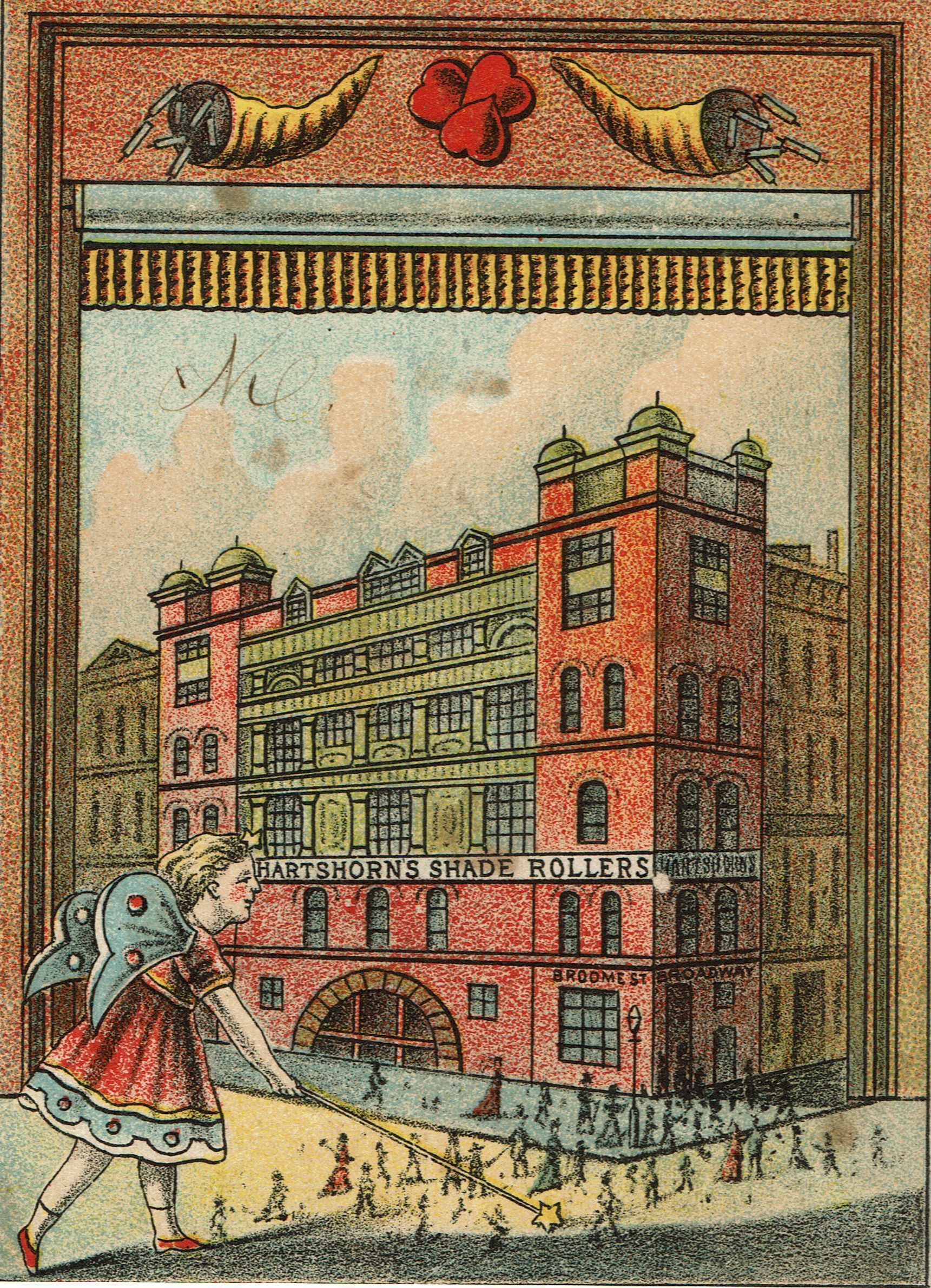 Hartshorn's Shade Roller's Advertising Trade Card, 1883. Featuring an illustration of the Hartshorn factory at the corner of Broome and Broadway (486 Broadway) in New York City. The text on the reverse tells the story of the image.Acquisition