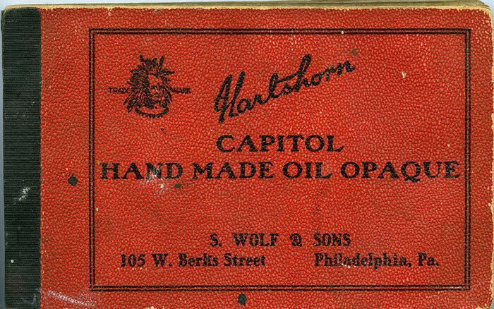 Book of samples of hand painted, solid color, oil paint, opaque cloth for roller window shades. Red cloth cover is titled "Hartshorn Capitol Hand Made Oil Opaque" and the store that sold the cloth for the shades was "S. Wolf & Sons; 105 W. Berks Street; Philadelphia, Pa. Cover has two 1/4" spots (of ink?) and is worn, especially on the edges. Binding on the spine is black cloth. First page and about four other pages scattered through the book are glossy paper. Remainder of the pages are samples of the painted cloth, with glassine-type separators with a spider web design. Purchased online (eBay?) from Mr. Art McManus; 137 W. Oneida St.; Oswego, NY 13126.Acquisition