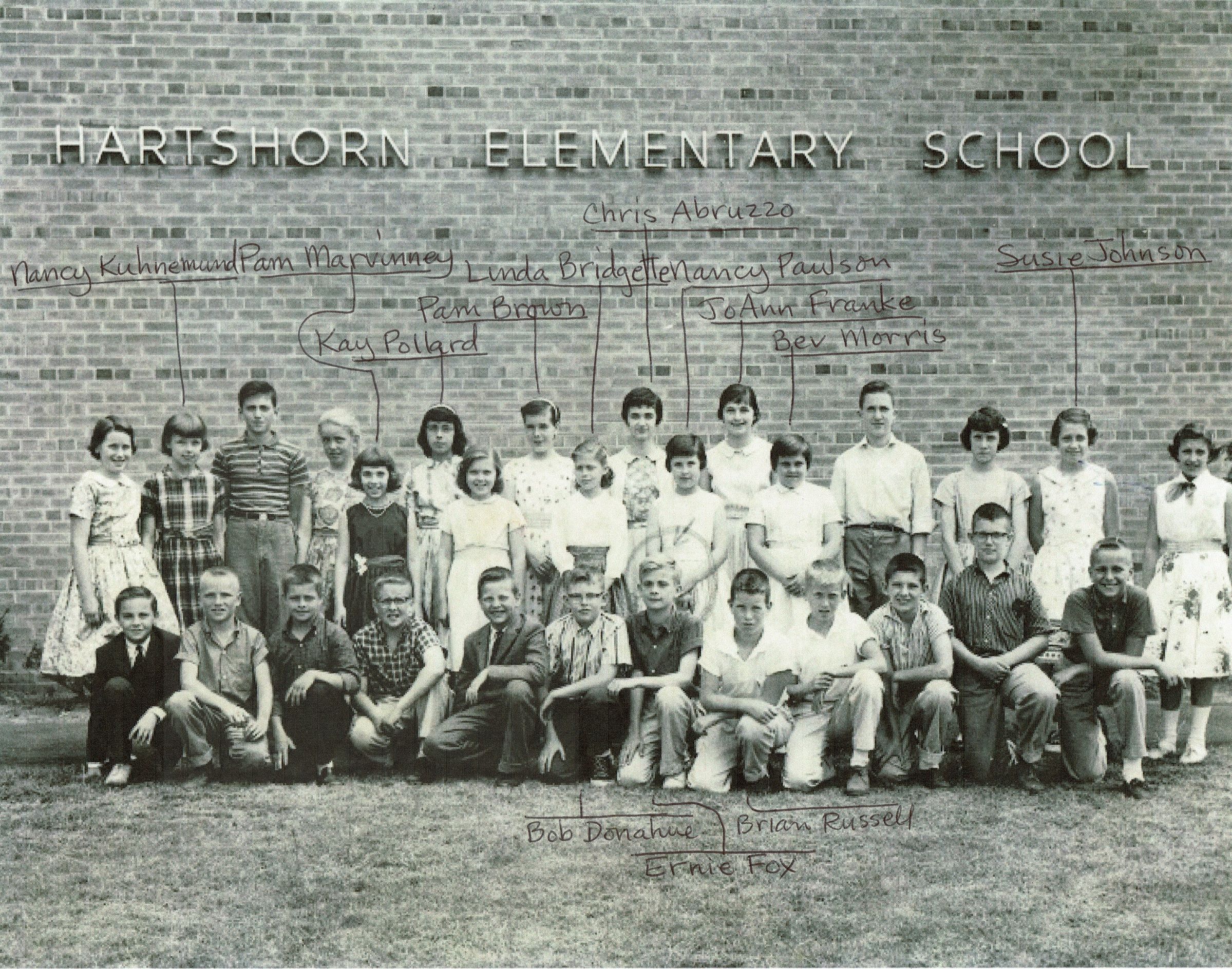 Copy of photograph of 5th or 6th grade students at Hartshorn Elementary School, c. 1959. Students identified in the photograph are: Nancy Kuhnemund, Pam Marvinney, Kay Pollard, Pam Brown, Linda Bridgette, Chris Abruzzo, Nancy Paulson, JoAnn Franke, Bev Morris, Susie Johnson, Bob Donahue, Ernie Fox and Brian Russell.Acquisition