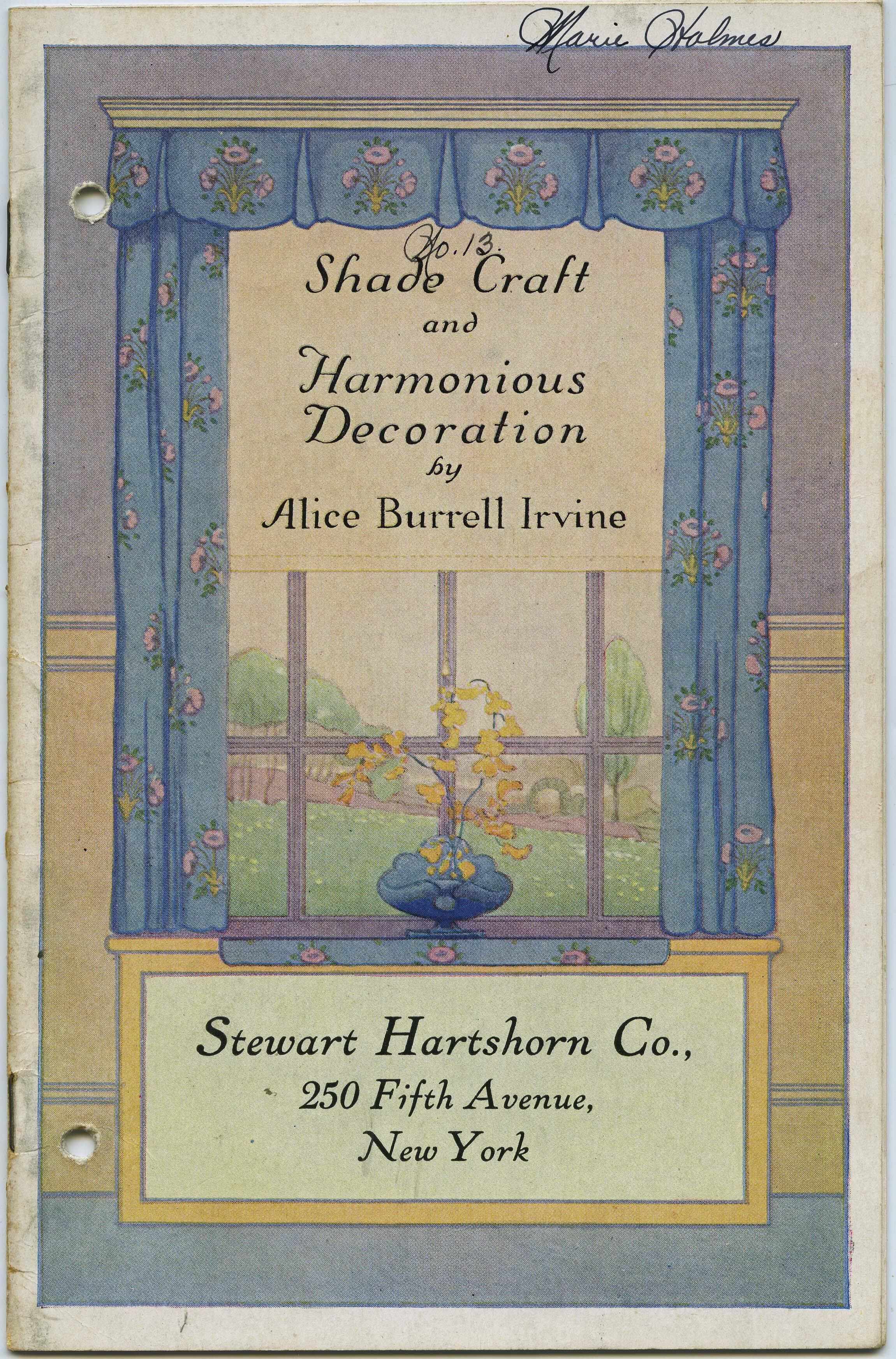 Stewart Hartshorn Company (250 Fifth Avenue, NY, NY) 16-page advertising booklet. Front cover has light overall soiling, especially along the left edge. Top right corner of the front cover has "Marie Holmes" written in ink and "No. 13" in ink above the booklet title on the front cover. There is a paper clip indentation on the back cover top edge (not rusted). Purchased online (eBay?) from J. Rowe, 2120 State Route 49, Arcanum OH 45304-9441.Acquisition