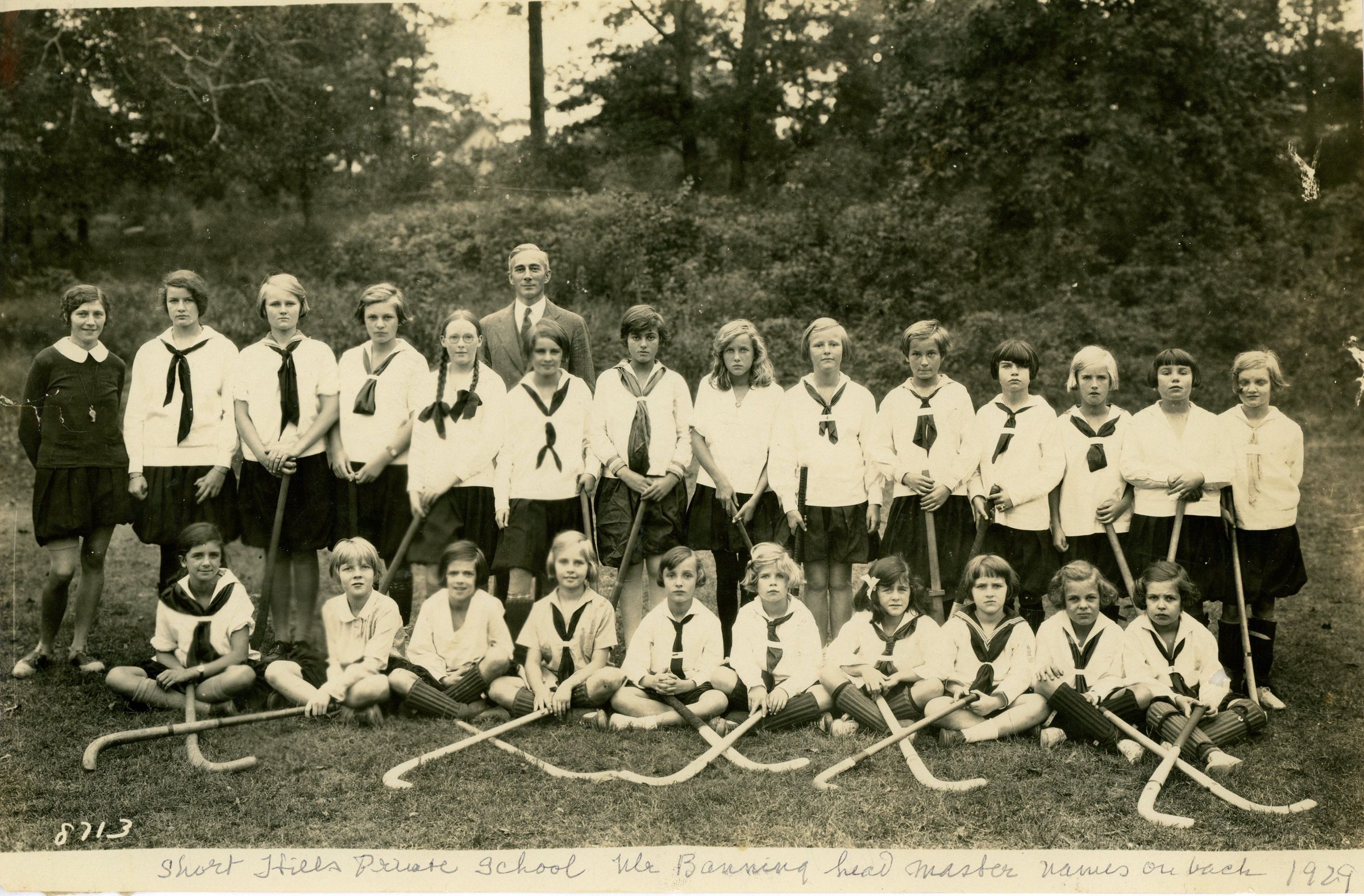 Photograph of the Short Hills Country Day School Girl's Field Hockey Team from 1929, with headmaster Mr. Banning. The photograph includes Catherine Hartshorn, standing and 5th from the left. Names of students are written on verso of photograph.
