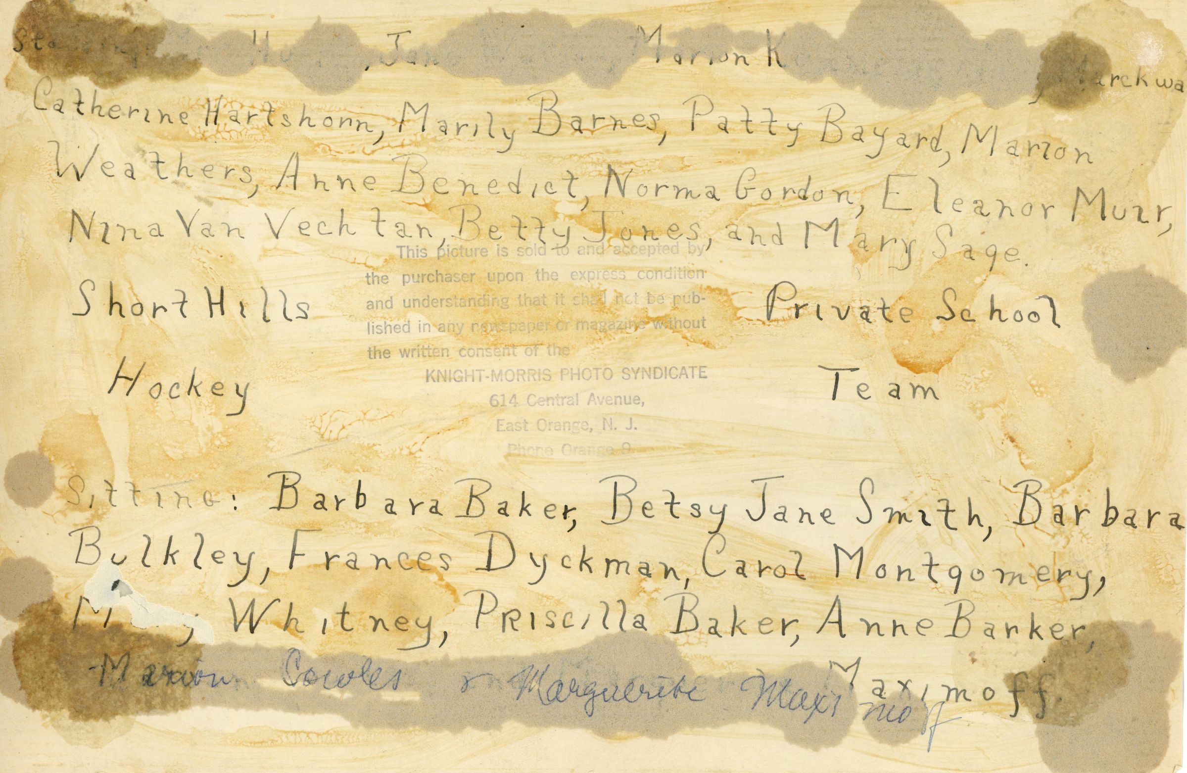 Standing (from left to right): (?), Jane W (?), Marion K, ? Markwa, Catherine Hartshorn, Marily Barnes, Patty Bayard, Marion Weathers, Anne Benedict, Norma Gordon, Eleanor Muir, Nina Van Vechten, Betty Jones and Mary Sage.Acquisition