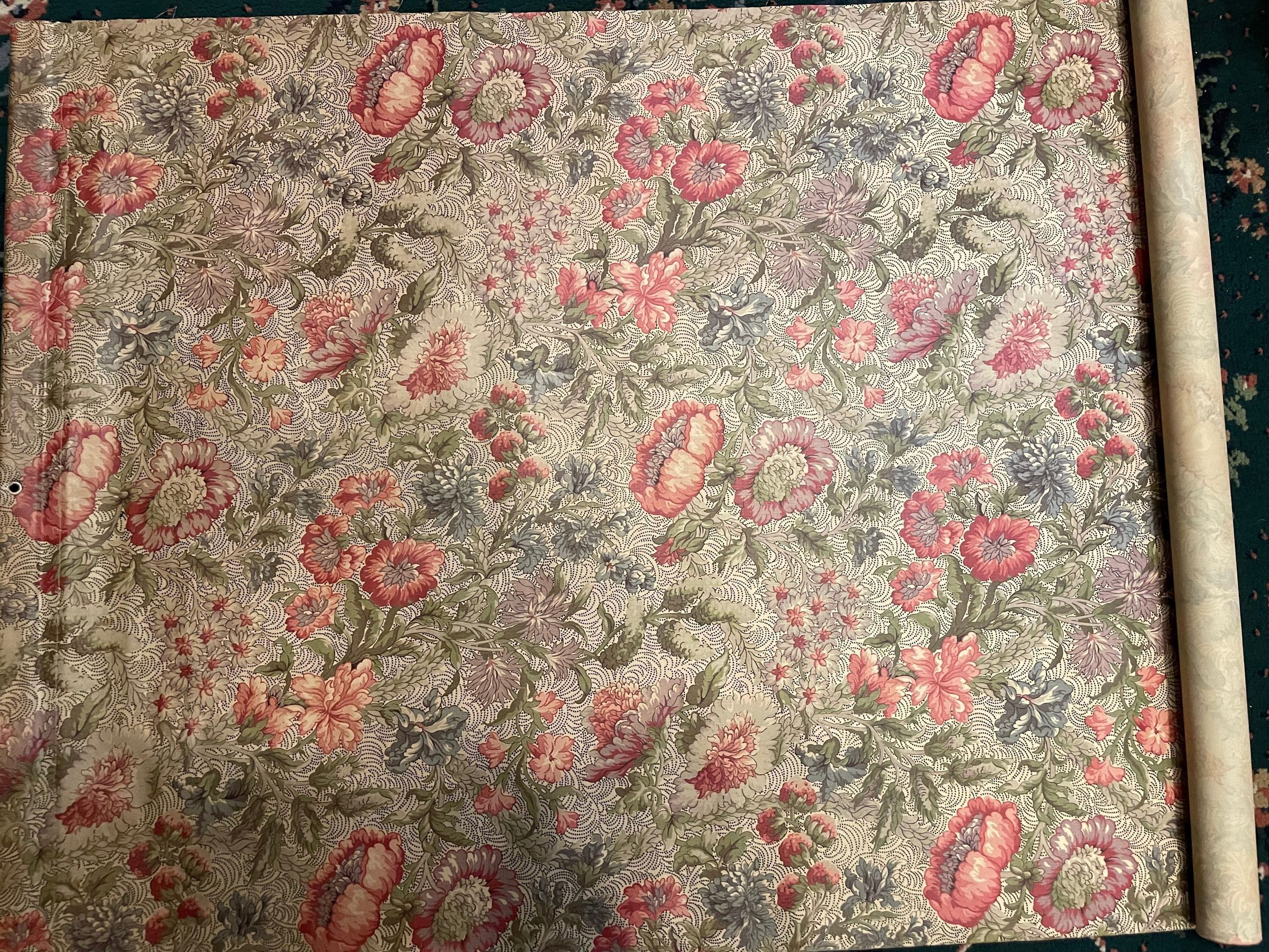 Floor to ceiling spring roller shade with floral pattern made by the Hartshorn Company.
