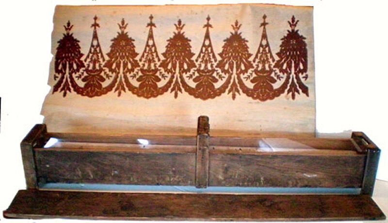 Box contains four stenciled roller window shades. The label on wooden dowels of all four shades is marked ' "THE STERLING" ; Spring Stop Shade Roller: (Patent Applied for); for 88 inch shades, 7 feet long, ask for the brass cap end.' Beneath that are directions for the use of shade. At top of label is, "For longer and heavier shades use the Hartshorn roller". All shades fully open measure ca. six feet long and 38" across with rods. There are three shades with an applied teal-colored pattern in a floral vase/urn design. There is one shade with an applied brown-colored pattern in a garland swag floral design. All four shades show signs of severe wear with browning, tears and dirt. There is one very soiled wooden rod 27.6" X 0.20" and one brown metal rod 17.13" X 0.125"Collection