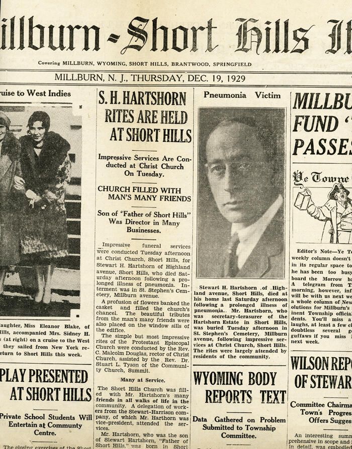 Eight page two-sheet edition of the December 19, 1929 Millburn-Short Hills Item newspaper containing the obituary of Stewart H. Hartshorn (Stewart Hartshorn, Jr.), who was the Secretary Treasurer of the Hartshorn Estate.Acquisition