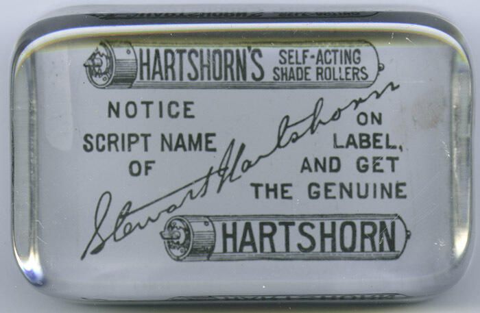 Glass advertising paperweight for Stewart Hartshorn's shade roller business. Purchased on eBay from June Chang; 314 N. 74th St.; Seattle WA 98103-5026. Fine scratches overall on top surface. Pin-prick ding in upper left corner of top and 1/3 of the way from the top along the left side of the top surface. Tiny dark dots on bottom of paperweight, primarily along the Hartshorn signature, but also on the right ends of both shade roller sketches; they appear to be--or were--bubbles on the white paint(?).Collection