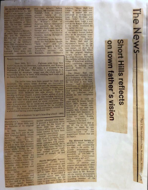 5 photographs along with a news clipping related to Stewart Hartshorn and his impact on Short Hills. All photographs donated by Owen Lampe.Collection