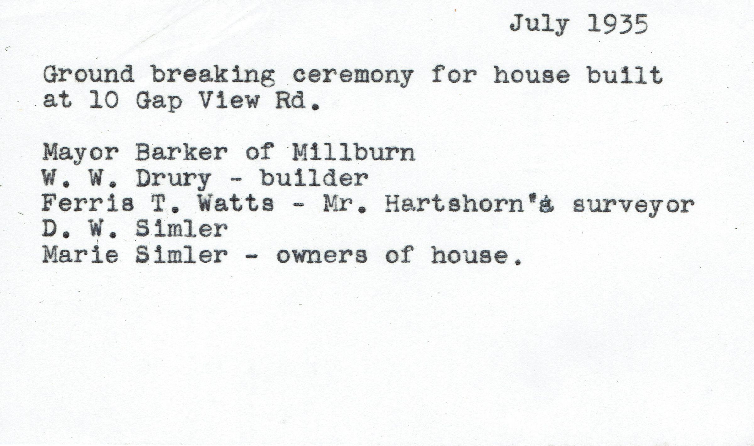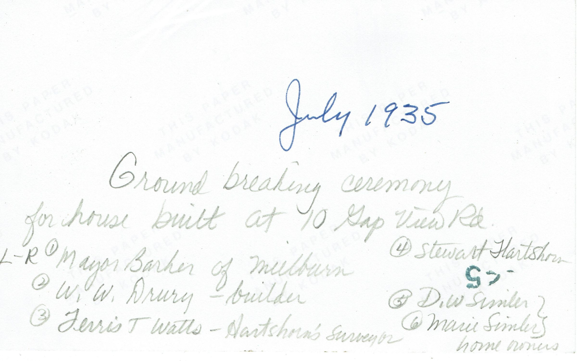 Groundbreaking ceremony for house built at 10 Gap Road showing (Left to Right): Mayor Barker of Millburn, W.W. Drury (builder), Ferris T. Watts (Mr Hartshorn's surveyor), D.W. Simler and Marie Simler (owners of the house).