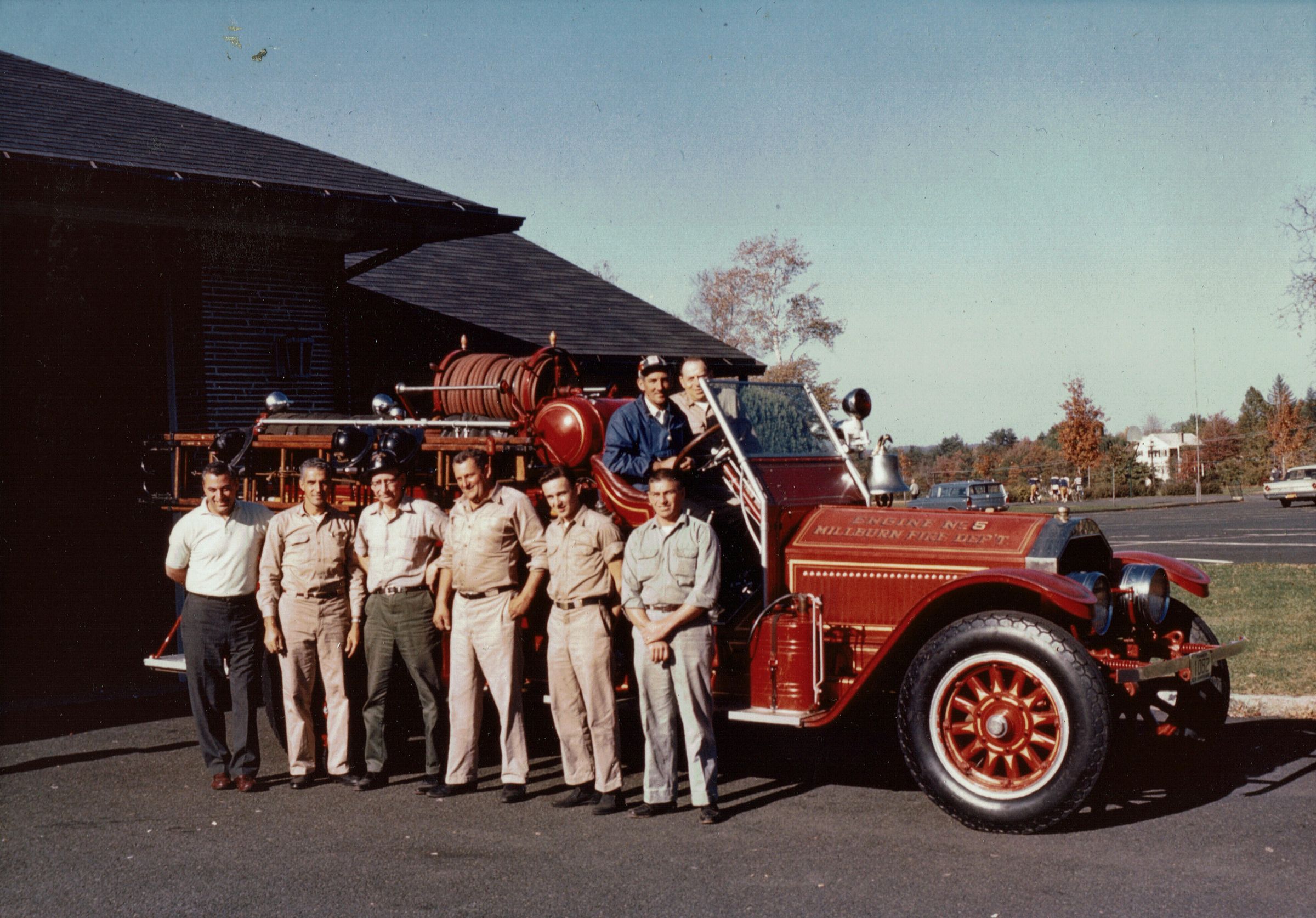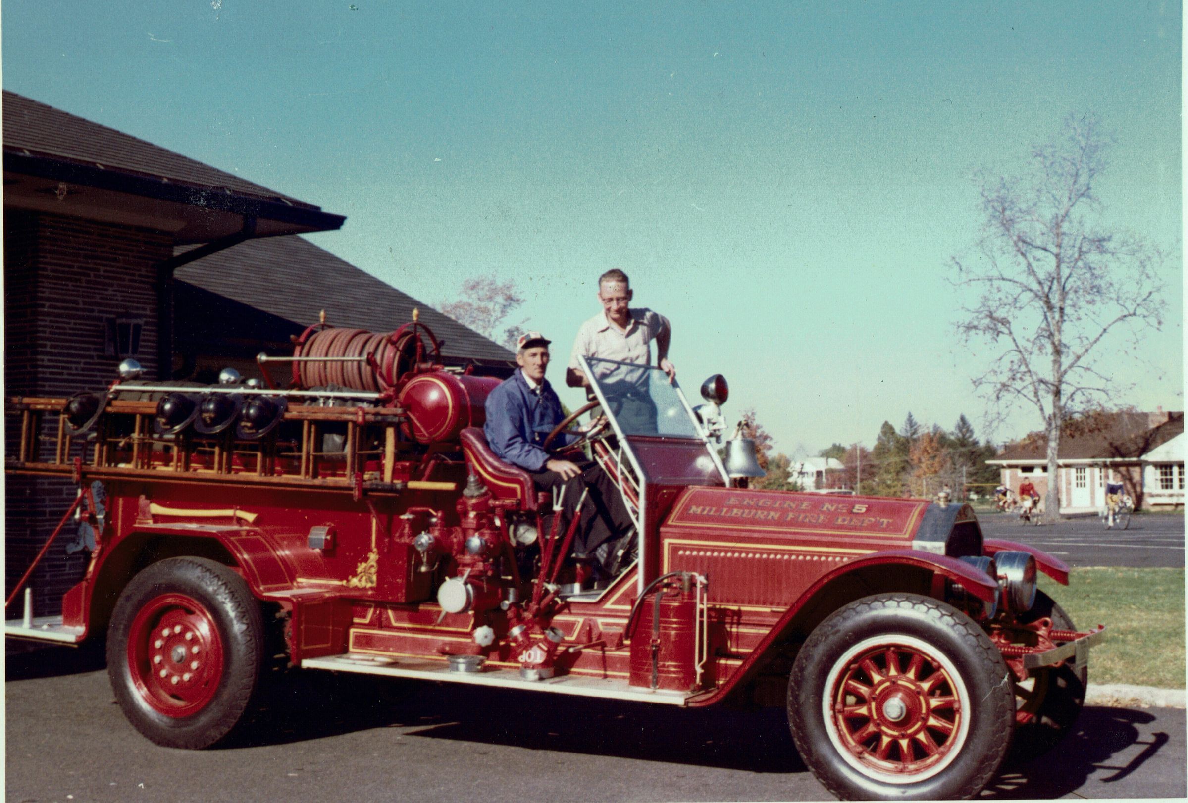 Photographs of Stewart Henry Hartshorn, Jr., at the Short Hills Fire House #2 in September 1963. Hartshorn purchased Millburn Fire Department Engine #5 at this time and donated it to a fire station in Cedar Harbor, New Hampshire. Photograph shows Stewart Hartshorn and Monty Monahan in the truck.5 x 7" color photographs (3), 3 1/2x 5" color photographs (5).Acquisition
