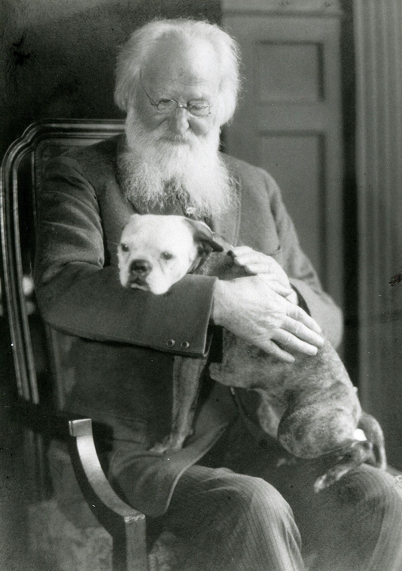 Photograph of Stewart Hartshorn, Sr. with his Boston Bull Terrier taken by Cora Hartshorn.Collection