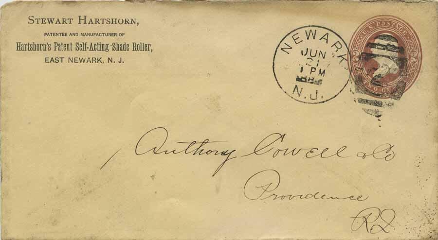 Empty 1887(?) envelope from "Stewart Hartshorn; Patentee and Manufacturer of; Hartshorn's Patent Self-Acting Shade Roller; East Newark, N.J." to Anthony, Cowell, & Co. Providence, R.I. Anthony, Cowell * Co. were recorded in the 1889 Providence RI city Directory as purveyors of