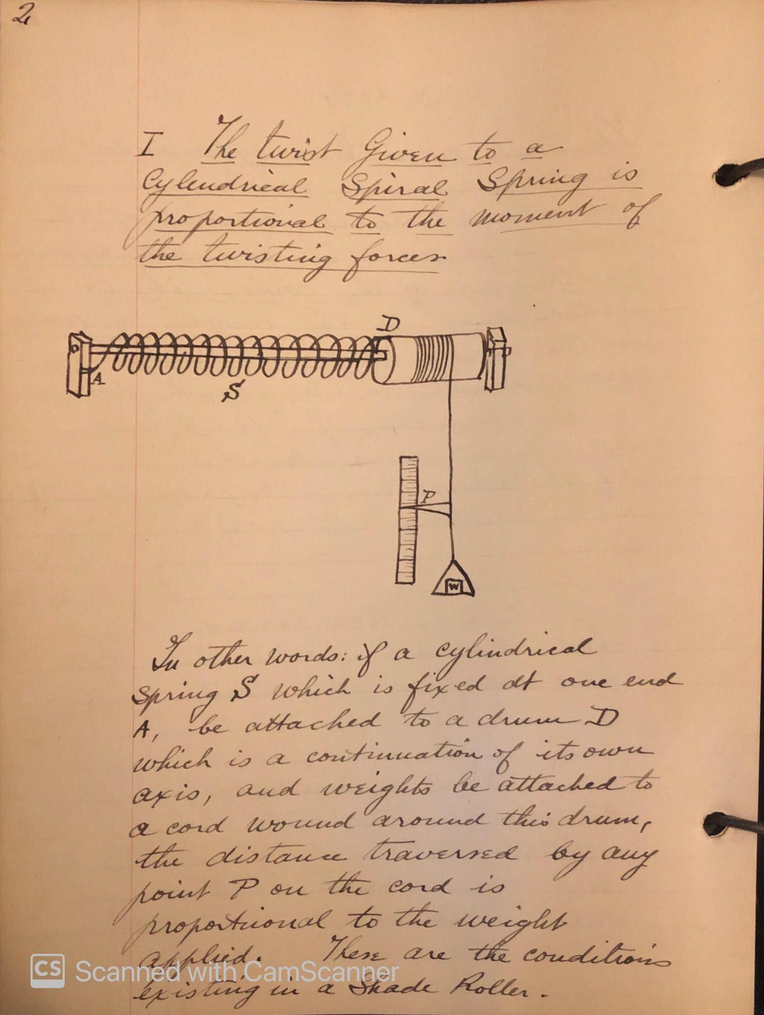 Notebook titled "Data and Experiments on the Bonding or Flexure of Cylindrical Spiral Springs on the first page." Range of sketches and notes and dimensions regarding roller shades. Date of creation unknown.Acquisition