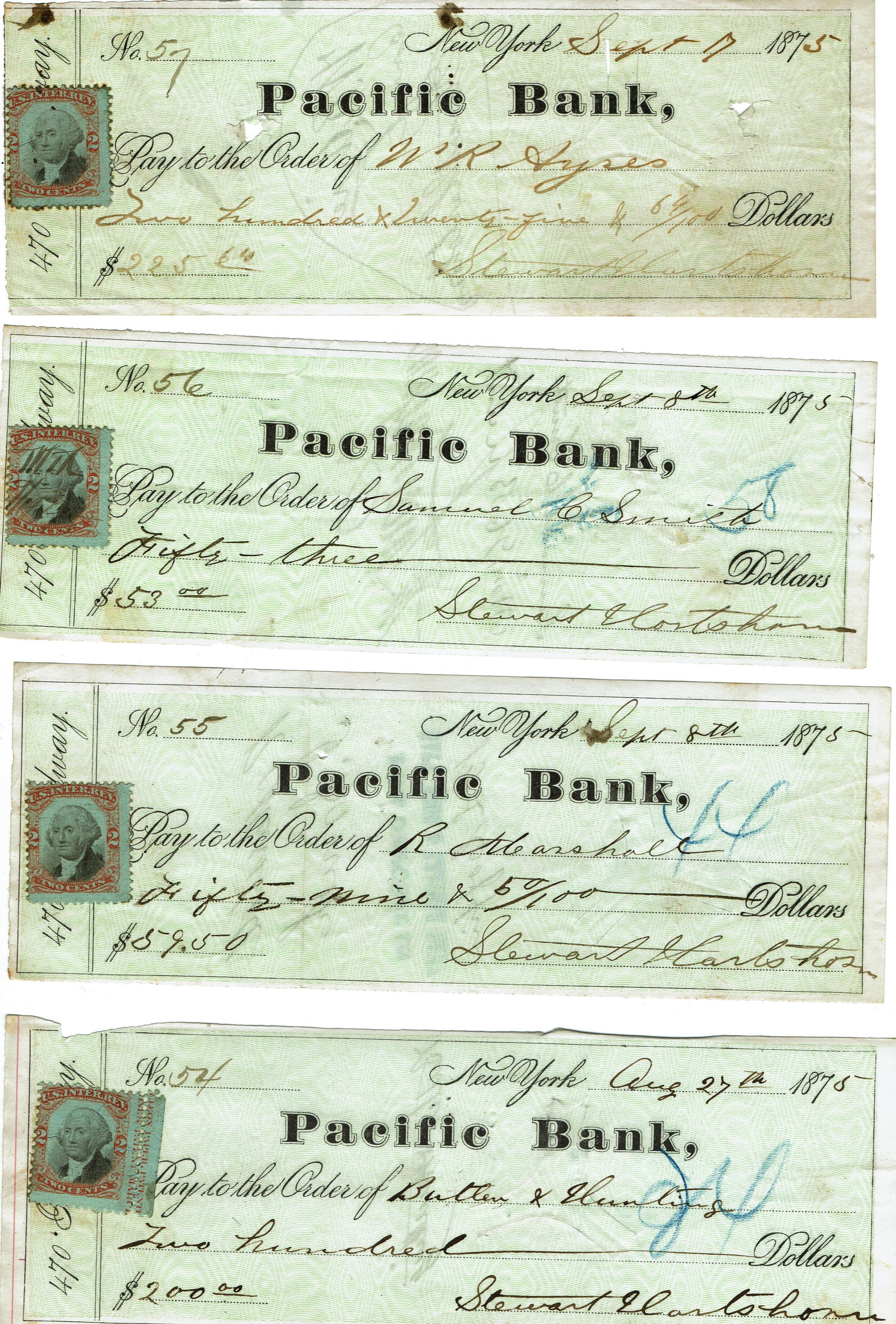 Cancelled checks from the Stewart Hartshorn Company in 1875, all signed by Stewart Hartshorn. Checks include those to W.R. Ayres, Samuel C. Smith, R. Marshall, Butler & Hunting.Acquisition