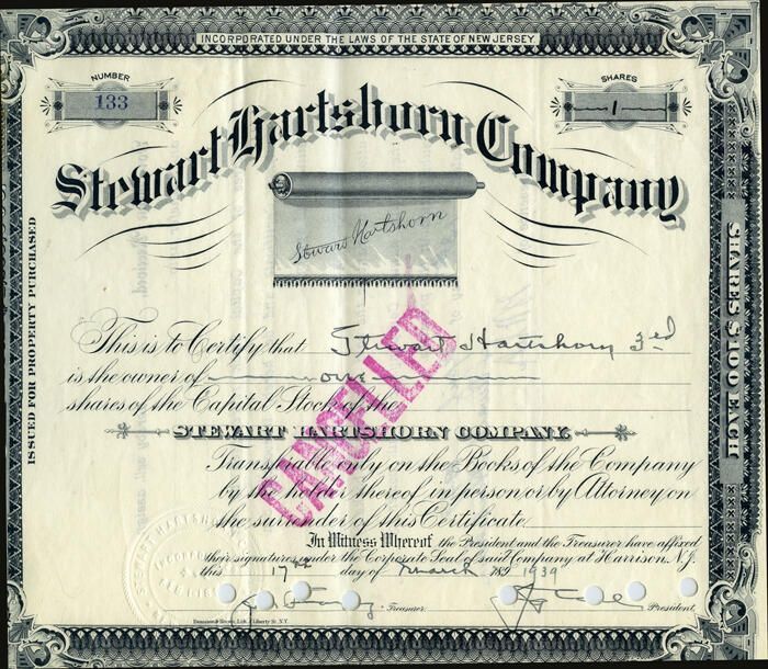 Stewart Hartshorn Company roller shade company stock certificate for one share sold to Stewart Hartshorn 3rd in 1939. "CANCELLED" is stamped in red diagonally across the certificate. To the left of the certificate is a half-sheet that notes that the certificate was surrendered in 04-13-49. Attached to that half-sheet is a torn piece of paper on which is typed: "RECEIVED from the Stewart...Company, one share Stewart...Company stock, Certificate...the name of Stewart Hartshorn." Beneath that is stamped "MAR 18 1939; c/o FIDELITY UNION TRUST CO; 755 BROAD STREET, NEWARK." A vertical line of glue indicated where the half-sheet is attached to the certificate.Acquisition