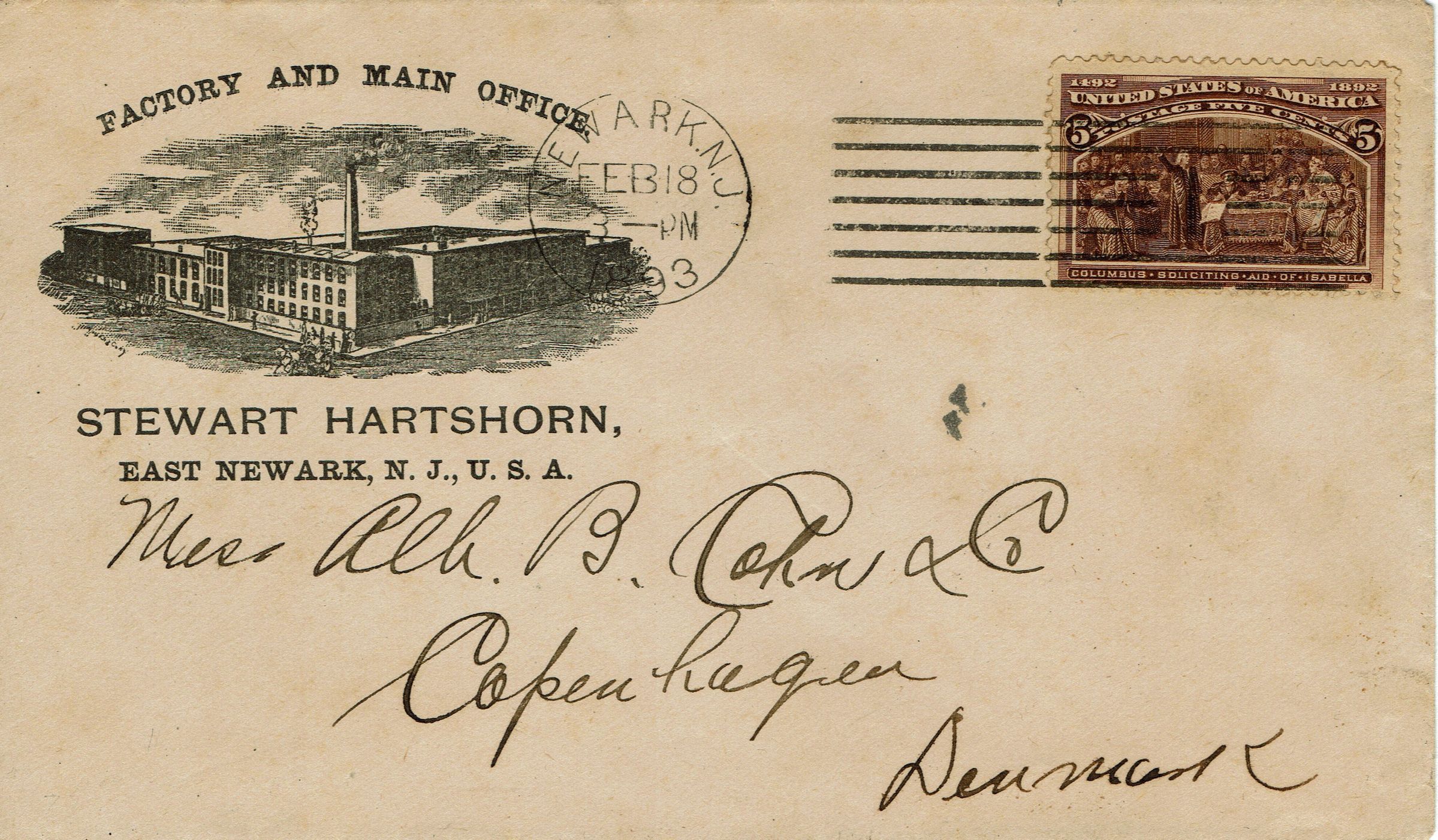 Postally used envelope from the Stewart Hartshorn, East Newark, NJ postmarked Newark, N.J., February 18, 1893 3:00 pm and sent to Alh. B. Cohn & Co, Copenhagen, Denmark. Contains engraving of Factory and Main Office in upper left corner of envelope.Acquisition