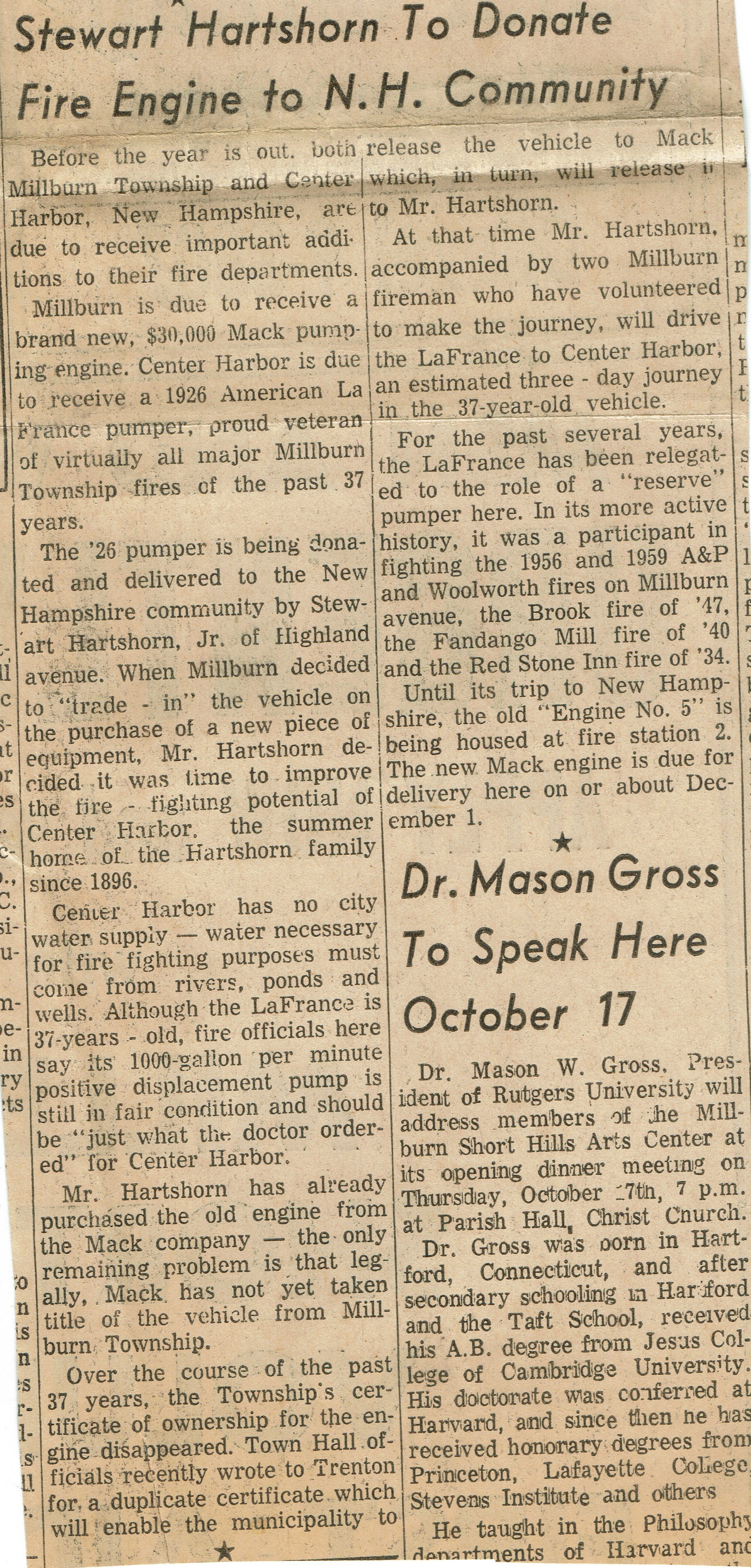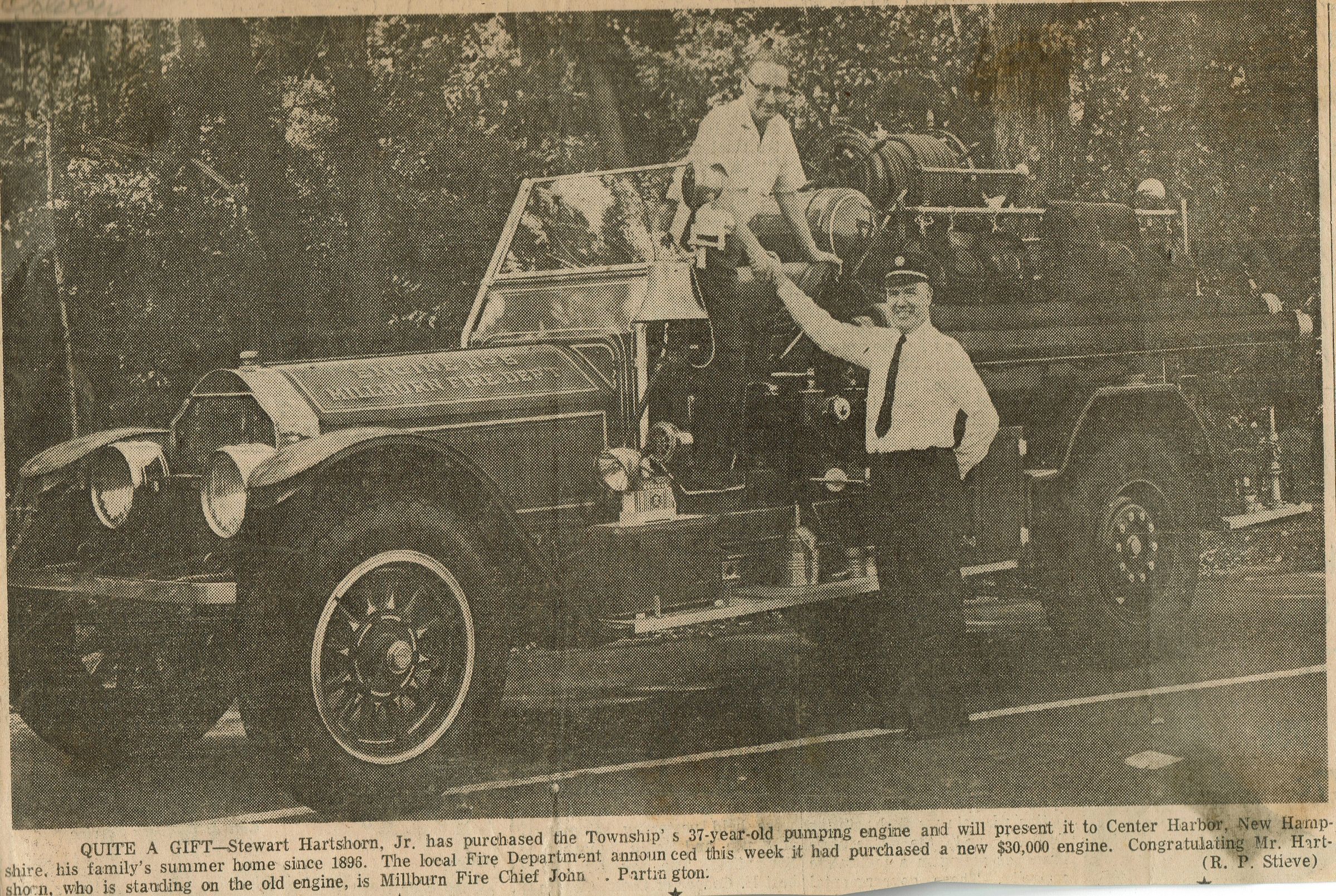 Article from the October 10, 1963 edition of the Item newspaper about Stewart Hartshorn, Jr.'s donation of a retired Millburn Fire Engine to the Center Harbor, New Hampshire Fire Department. Photograph depicts Stewart Harshorn, Jr. atop the 37-year-old pumping engine with Millburn Fire Chief John Partington standing next to the engine.Acquisition