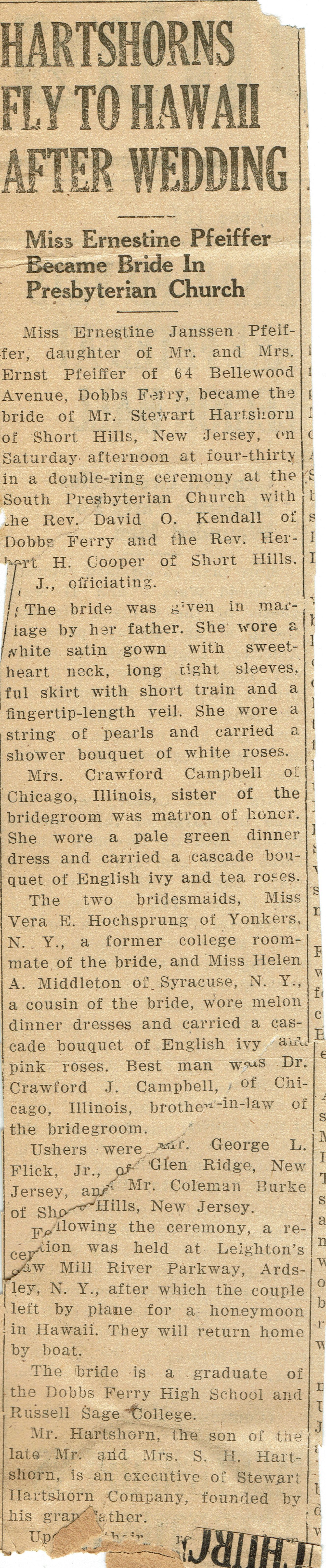 Wedding announcement from a Dobbs Ferry newspaper of Stewart Hartshorn, Jr. and Ernestine Janssen Pfeiffer detailing the newlyweds plans to honeymoon in Hawaii. Stewart and Ernestine were married on September 20, 1947.Acquisition