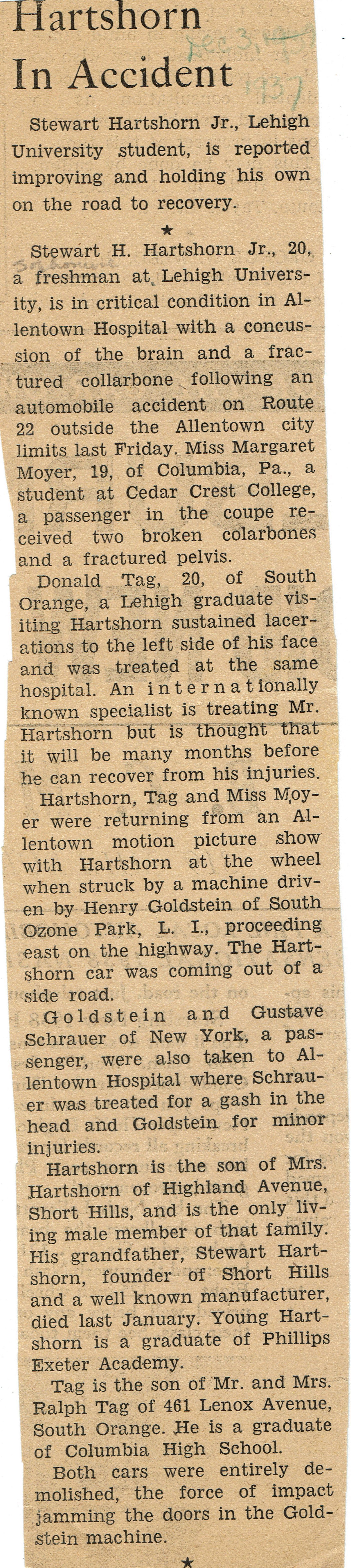 Article about Stewart Hartshorn, Jr. (III) in an automobile accident from December 3, 1937.Acquisition