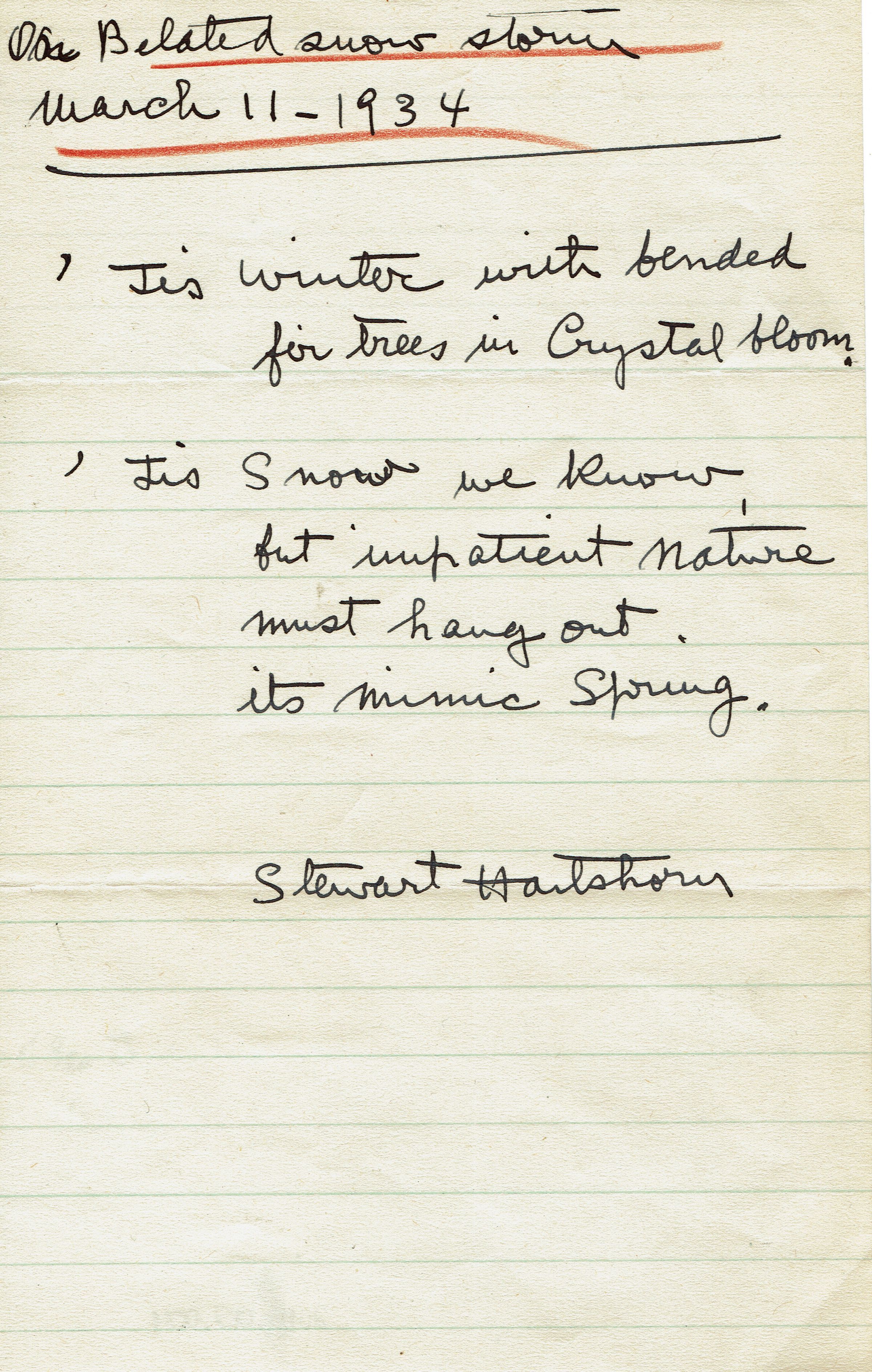 Poem entitled "On Belated Snow Storm-March 11, 1934" written by Stewart W. Hartshorn.Collection