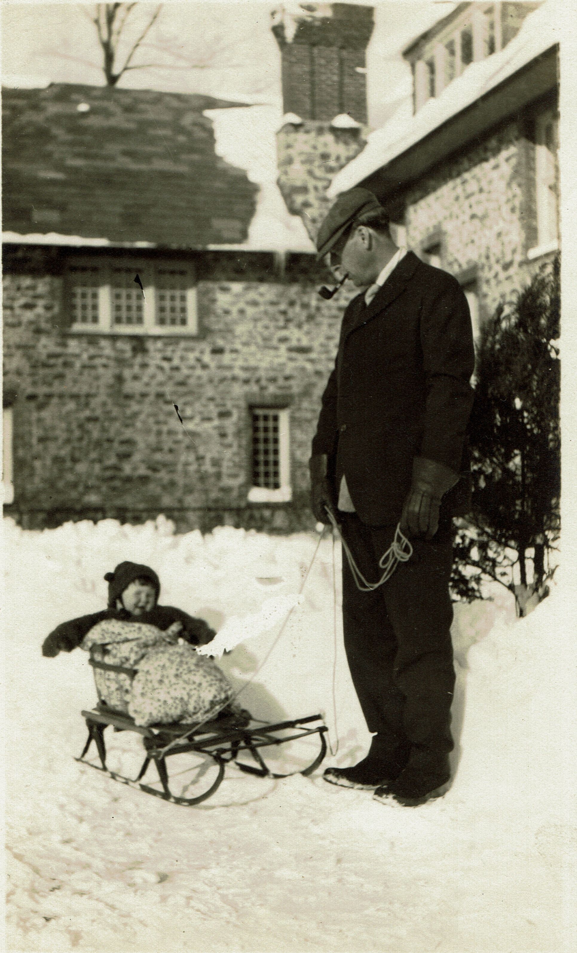 Photograph of Stewart Henry Hartshorn pulling his daughter Catherine Jennette Hartshorn in a sled from winter 1917.Collection