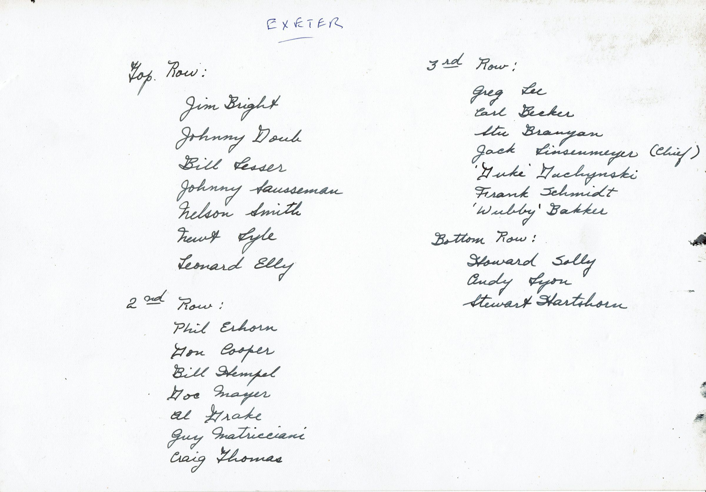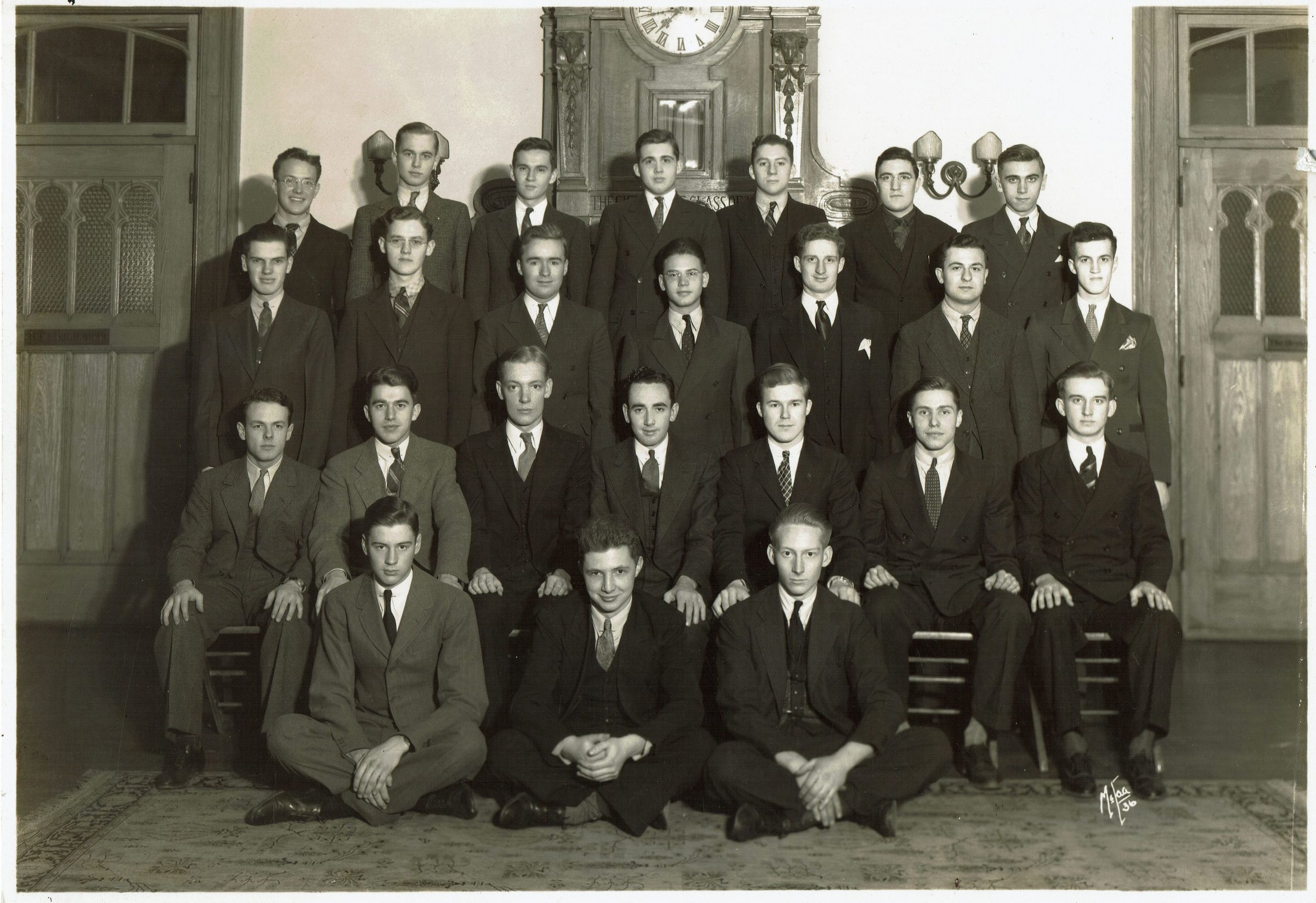 Photograph of Stewart Henry Hartshorn, Jr.'s class at Exeter, 1936. Names of classmates inscribed on back of photograph as follows: Top Row: Jim Bright, Johnny Doub, Bill Lesser, Johnny Sausseman, Nelson Smith, Newt Lyle, Leonard Elly; Second Row: Phil Erhorn, Don Cooper, Bill Hempel, Doc Mayer, Al Drake, Guy Matricciani, Craig Thomas; Third Row: Greg Lee, Carl Becker, Stu Branyan, Jack Linsenmeyer (Chief), Duke Duchynski, Frank Schmidt, 'Wubby' Bakker; Bottom Row: Howard Sally, Any Lyon, Stewart Hartshorn.Acquisition