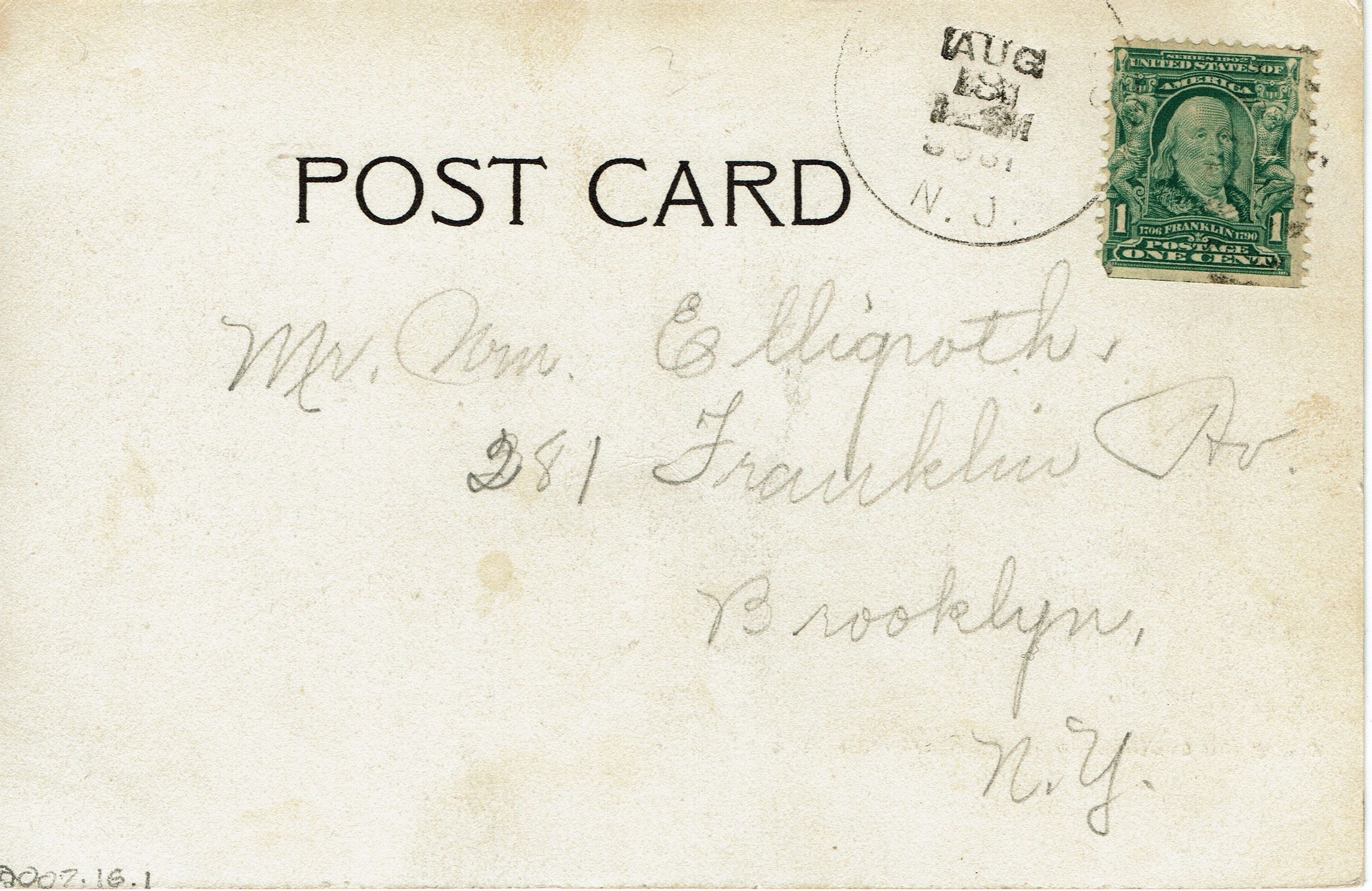 Along the Lackawanna R.R., Short Hills, NJ. Postally used, postmarked August 8, 1906. Addressed to Mr. William Elligroth, 281 Franklin Avenue, Brooklyn, NY.Collection