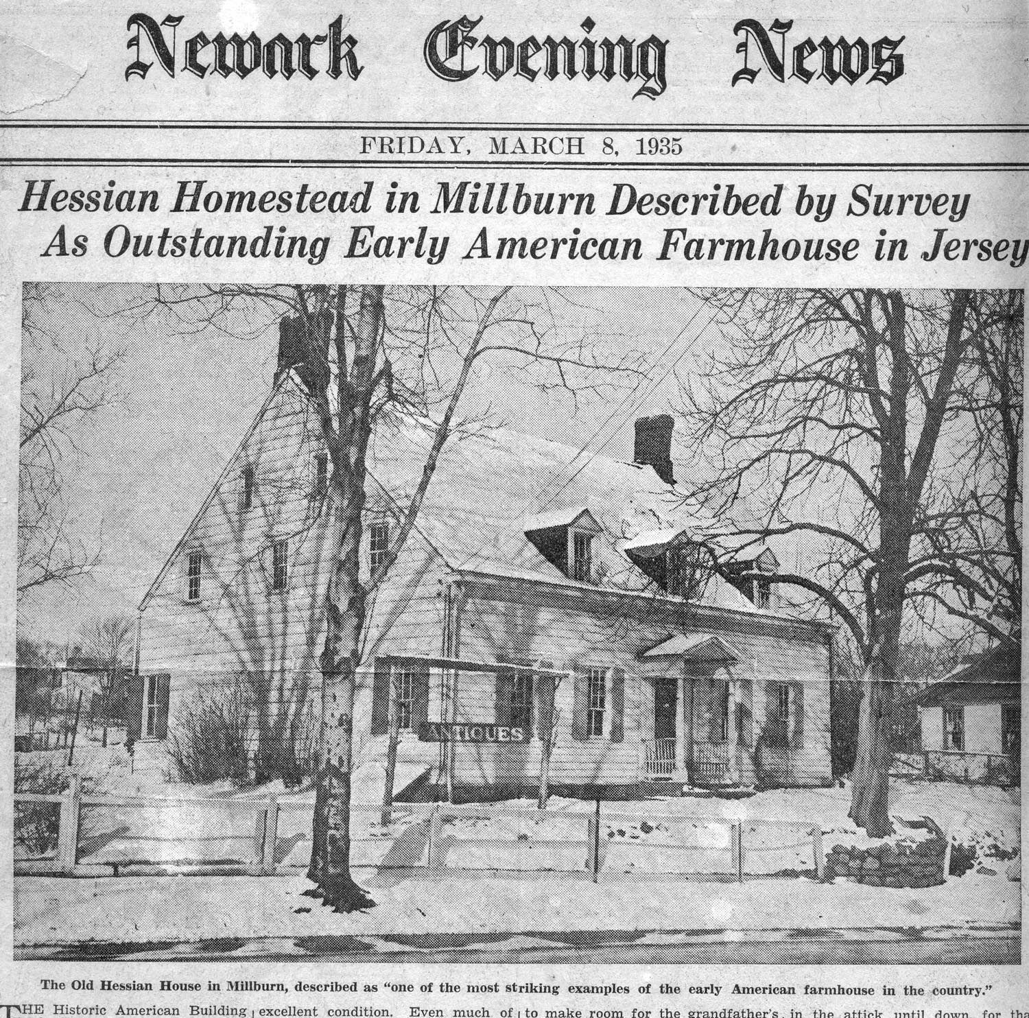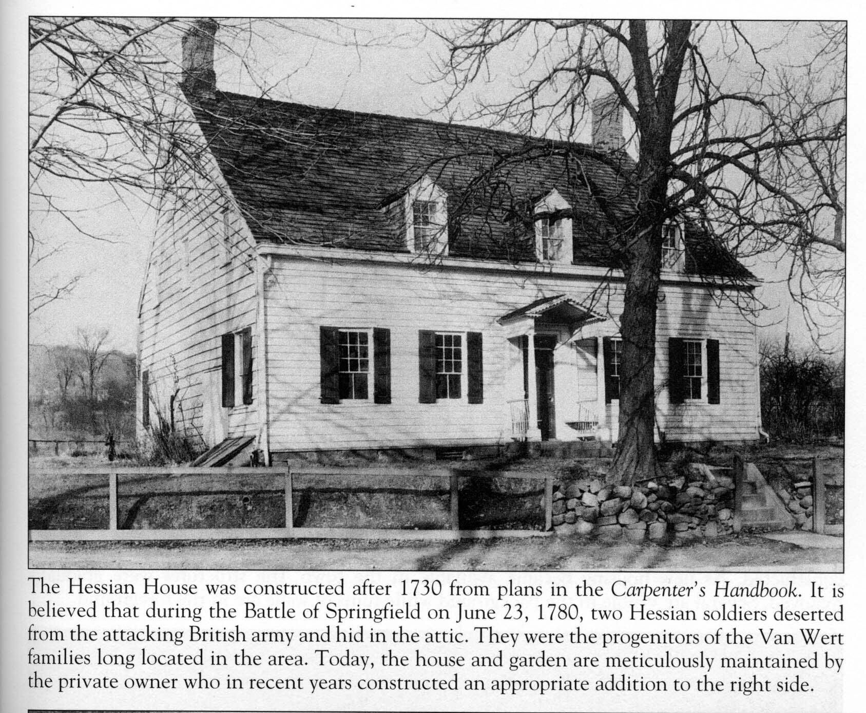 The Hessian House, restored and owned by Harvey Kahn (c. 1957). House was constructed shortly after 1740 from a design in the Carpenter's Handbook. Legend has it that two Hessian soldiers deserted during the Battle of Springfield on June 23, 1790 and hid in the attic. They were the Van Wert Brothers and are reputed to be the descendants of the Van Wests in this area.Dimensions