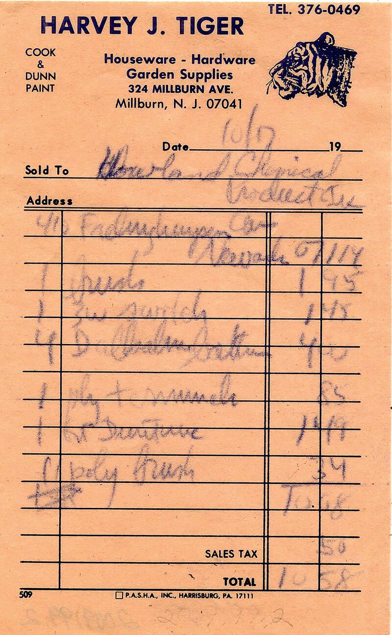Pink receipt/invoice from Harvey J. Tiger Hardware Store at 324 Millburn Ave., Millburn, NJ. No year, but appears to be c. 1980. Sold to Howland Chemical Products, Inc., 410 Frelinghuysen Ave., Newark, NJ. No apparent damage or wear. Found in estate sale at 176 Wyoming Ave., Maplewood, NJ.Acquisition