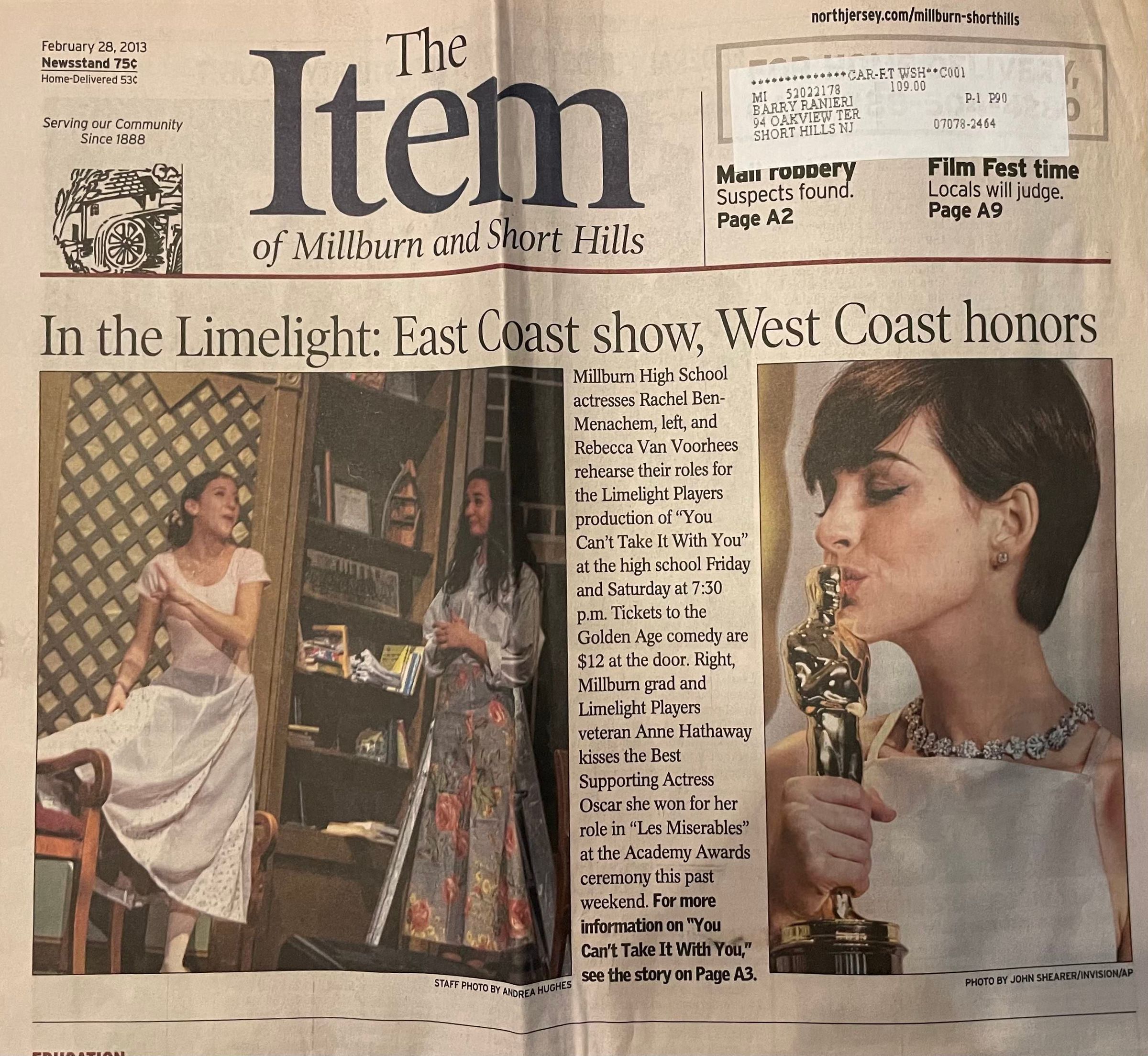 The article "In the Limelight: East Coast show, West Coast honors" talks about Anne winning the Oscar for Best Supporting Actress for her role as Fantine in Les Miserables at the 2013 Oscars.Acquisition