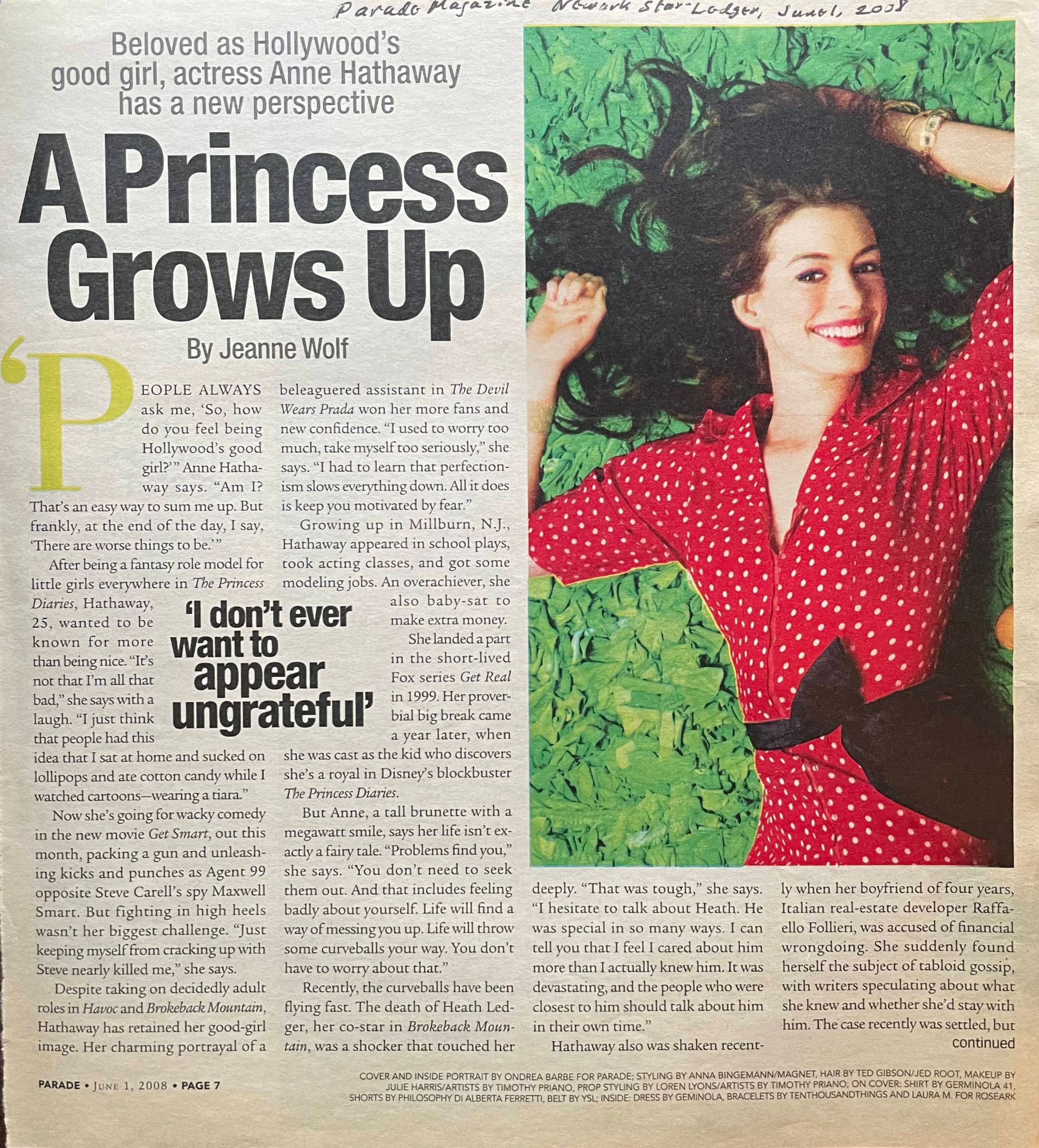 The Newark Sunday Star Ledger (June 2008) pictures Anne on the cover of Parade Magazine with the title "How Anne Hathaway GOT SMART". In the paper, the article "A Princess Grows Up" by Jeanne Wolf talks about Anne growing up, people's perception of her as "Hollywood's good girl", and current events happening in her life.Acquisition