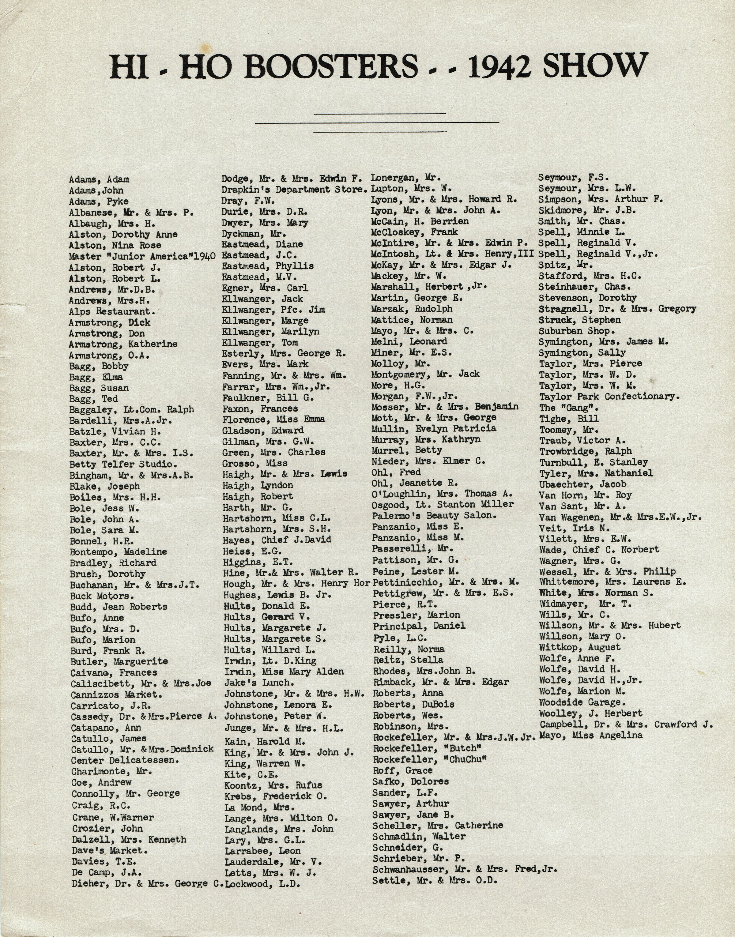 Program for the 11th annual Hi-Ho Musical Performance on December 4 & 5, 1942 at the Millburn High School. The proceeds of the 1942 performance went to the local American Women's Voluntary Services. 32 pp., extensively illustrated with advertisements from local businesses.Acquisition