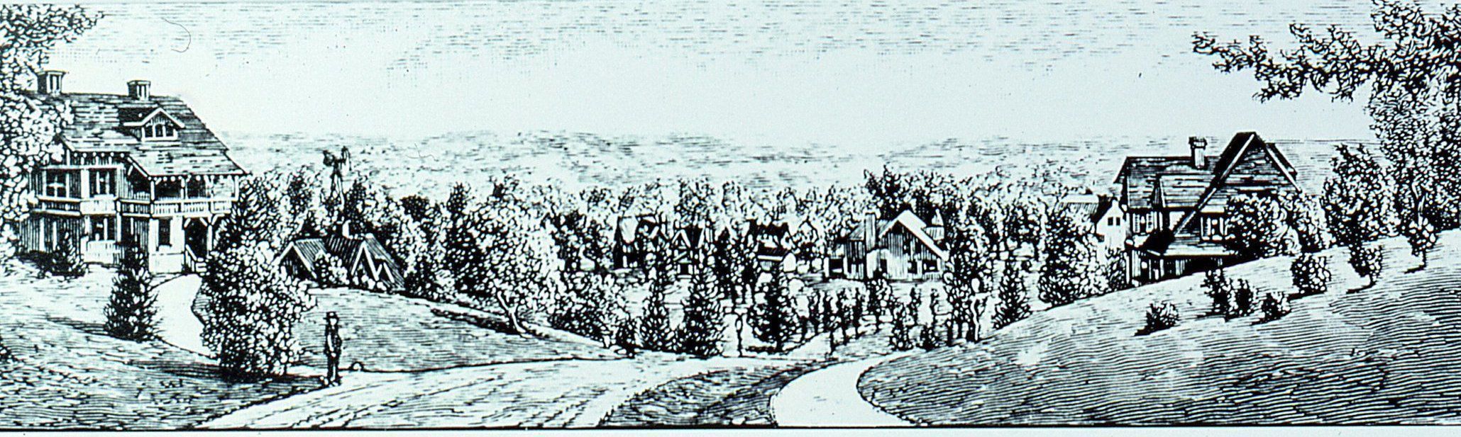 Slide of an etching showing a view down Highland Avenue in Short Hills from c. 1880.Collection