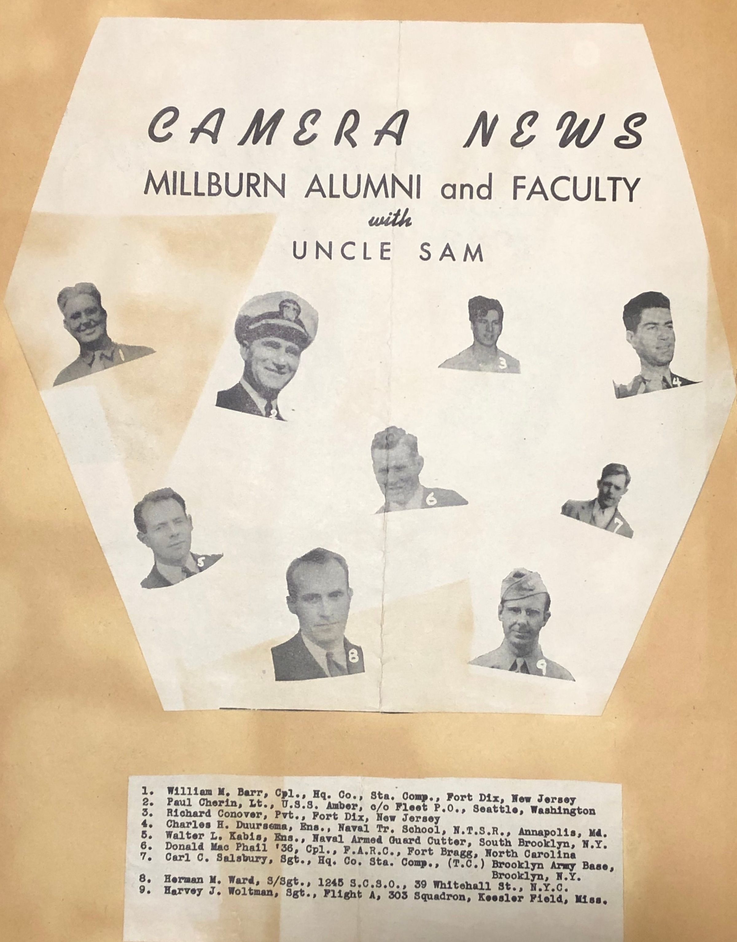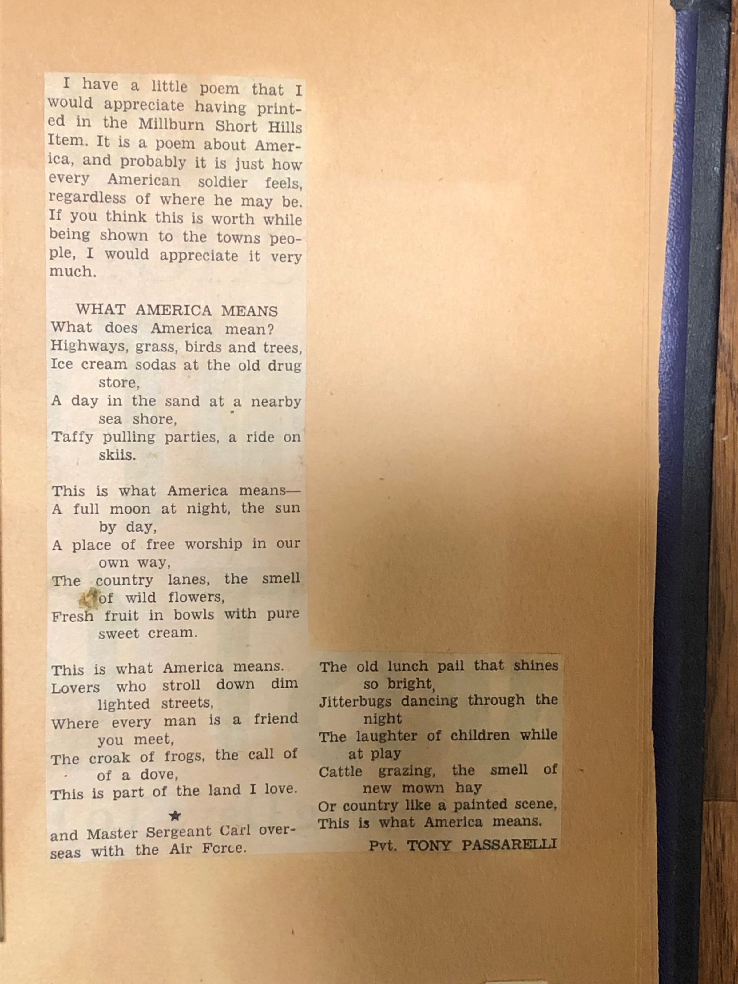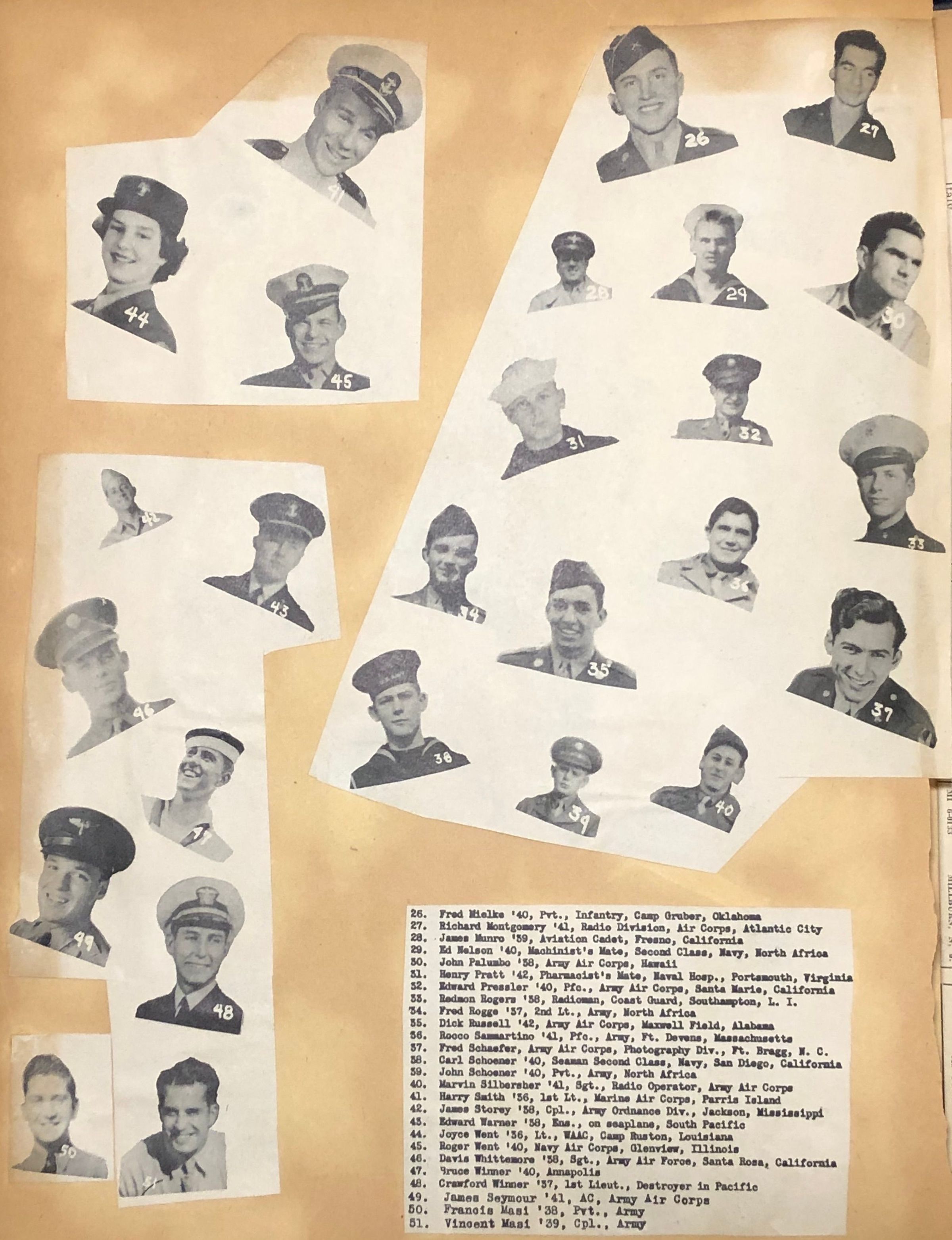 WWII Scrapbook with photograph and newspaper clippings from Margaret Hornecker. Has information on soldiers including Sgt. , Harry Lore, PFC Michael Bufo, Sgt Richard W Sweet Jr, Corporal William Monohan, Sgt. Marvin A Silbersher, Sgt. Mielke, Second Lieutenant Gilbert W Piddington, Lt. Percy Knott Jr, John C Flaherty, Adrian F Dedecker, Lt Percival L Knott Jr, 2nd Lt. Ralph George Almond, Pvt. Geoerge L Gallion, Warren De Palma, First Lt. AL Kahn, and more. Photographs of Carl Berberich, Alex Koschoreck. Sargent H. Norman Hornecker, Bernard C. Hornecker. Thomas and James Ellwanger, Charles, Jack and William Snyder (The Snyder Triplets).Acquisition