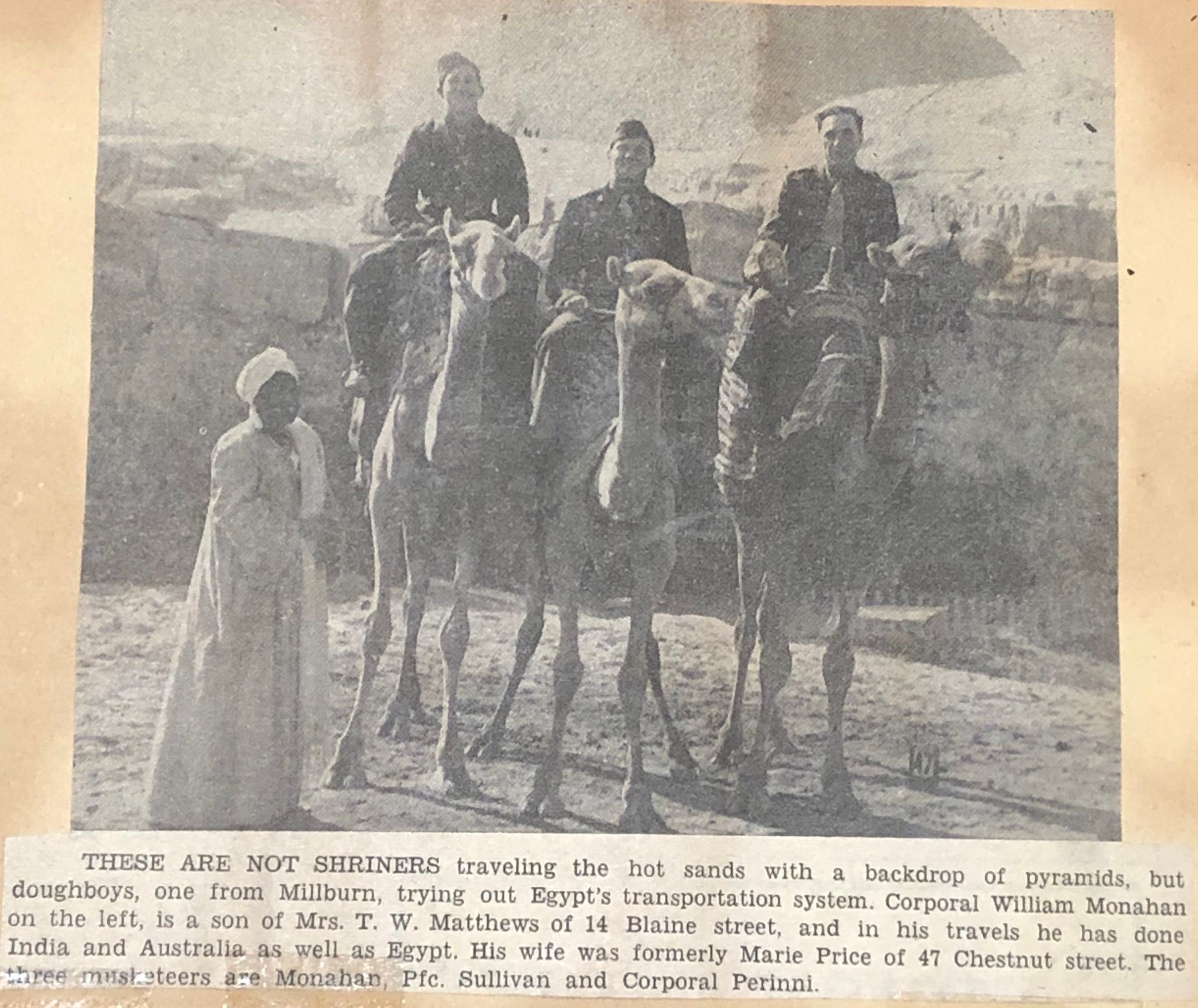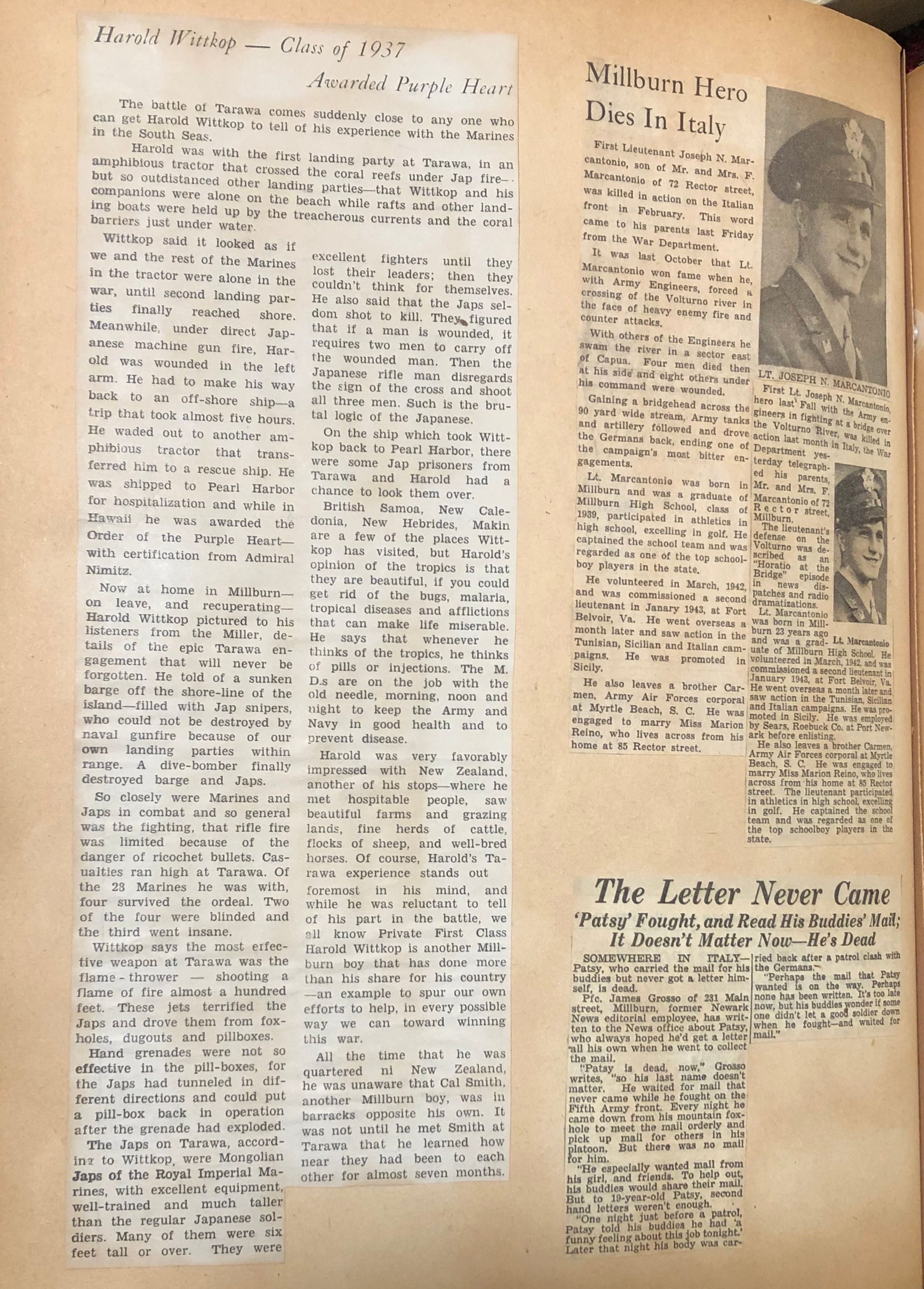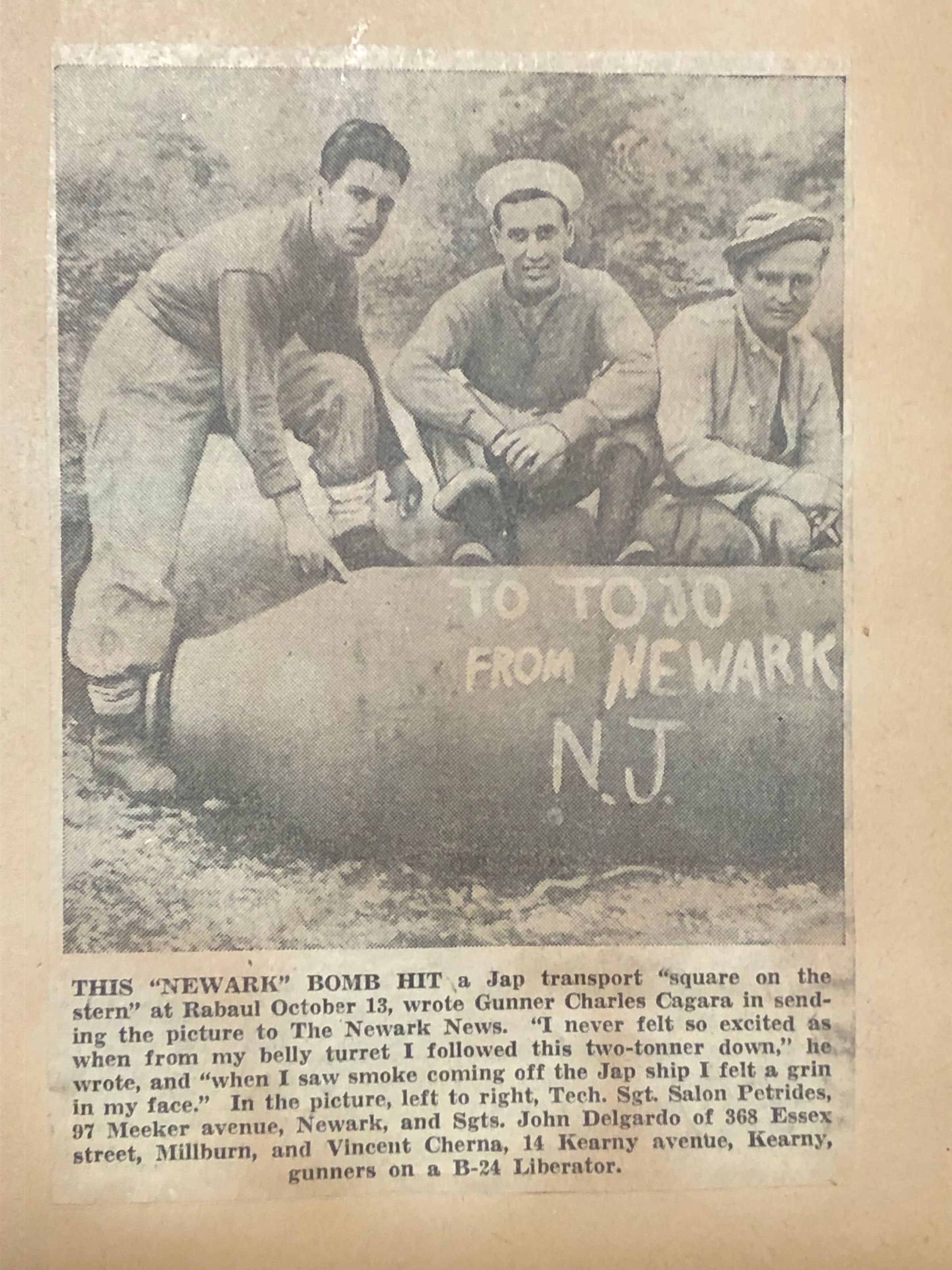 WWII Scrapbook with photograph and newspaper clippings from Margaret Hornecker. Has information on soldiers including Sgt. , Harry Lore, PFC Michael Bufo, Sgt Richard W Sweet Jr, Corporal William Monohan, Sgt. Marvin A Silbersher, Sgt. Mielke, Second Lieutenant Gilbert W Piddington, Lt. Percy Knott Jr, John C Flaherty, Adrian F Dedecker, Lt Percival L Knott Jr, 2nd Lt. Ralph George Almond, Pvt. Geoerge L Gallion, Warren De Palma, First Lt. AL Kahn, and more. Photographs of Carl Berberich, Alex Koschoreck. Sargent H. Norman Hornecker, Bernard C. Hornecker. Thomas and James Ellwanger, Charles, Jack and William Snyder (The Snyder Triplets).Acquisition