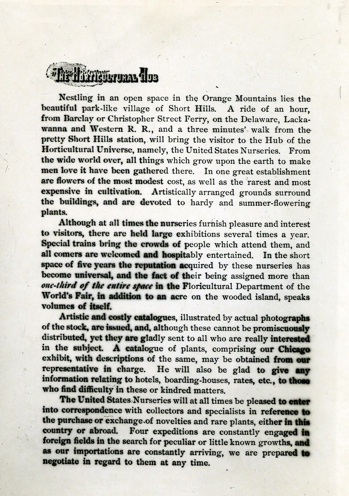 Write up on U.S. Nurseries includes the comment that over 1/3 of the space in the Floricultural Department at the 1893 Chicago World's Fair was assigned to them and over an acre of land on the wooded island.Collection