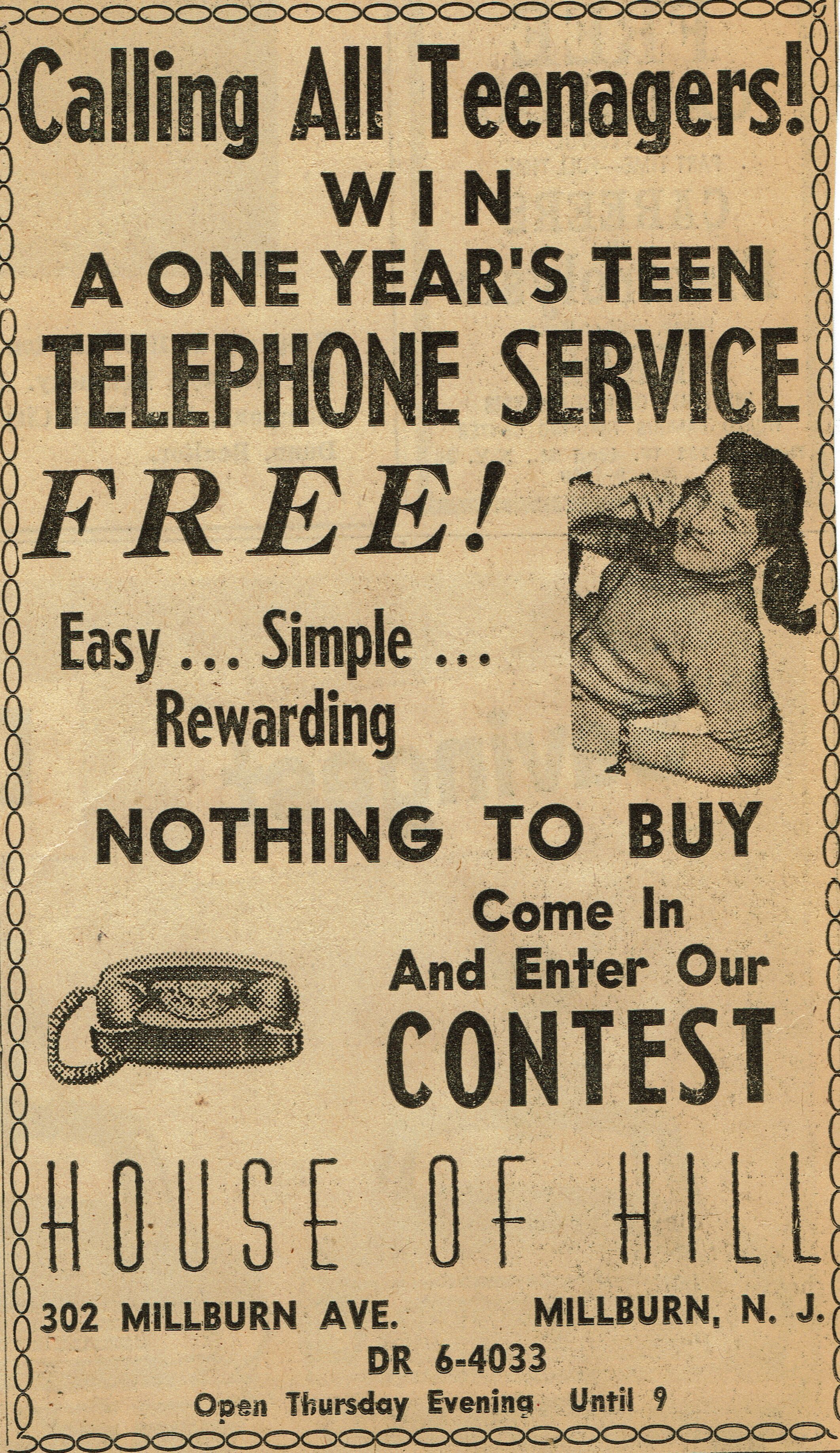 Advertisement for telephone service from the House of Hill, 302 Millburn Avenue. "Calling All Teenagers! Win a One Year's Teen Telephone Service Free." From The Millburn and Short Hills Item, August 16, 1962.Acquisition