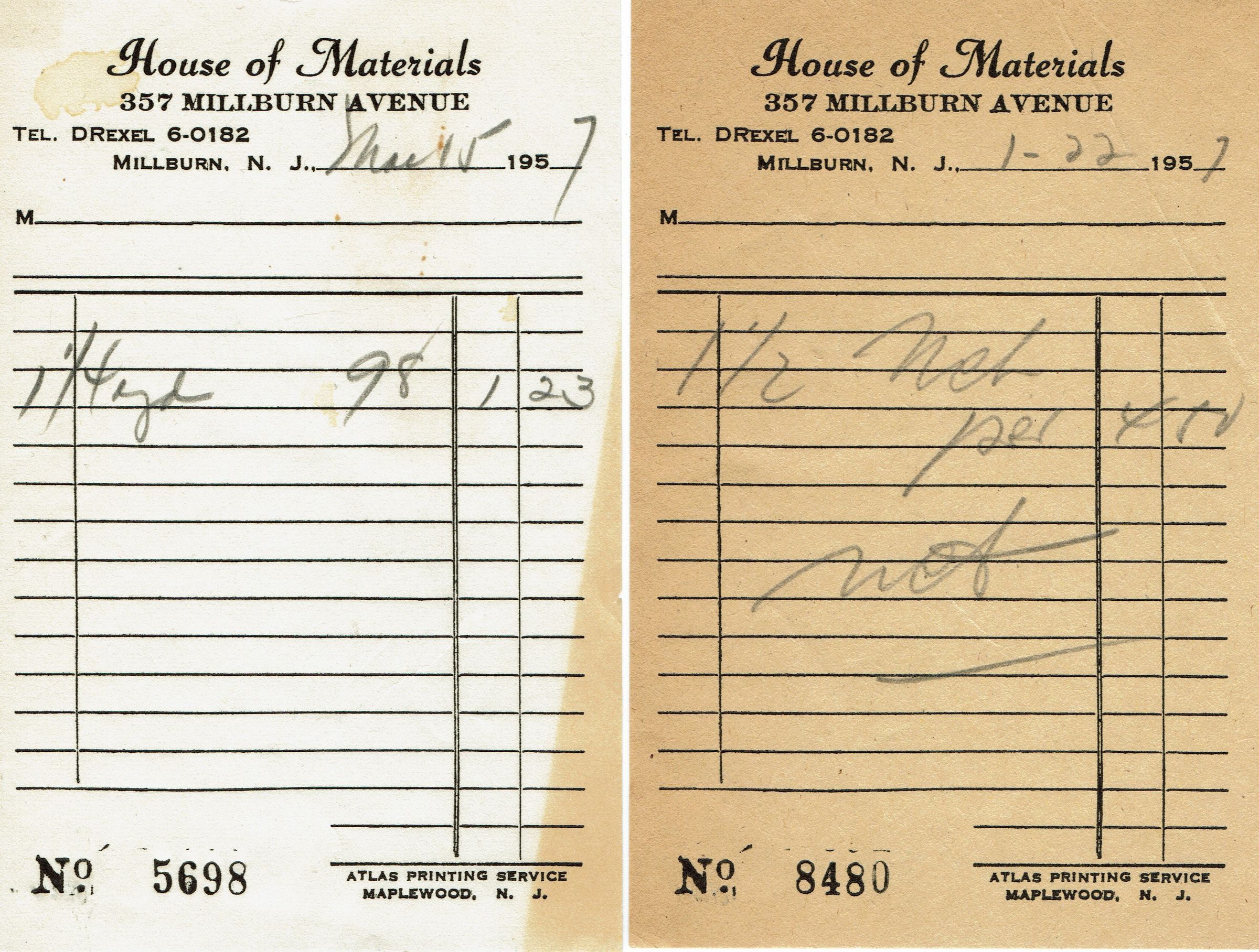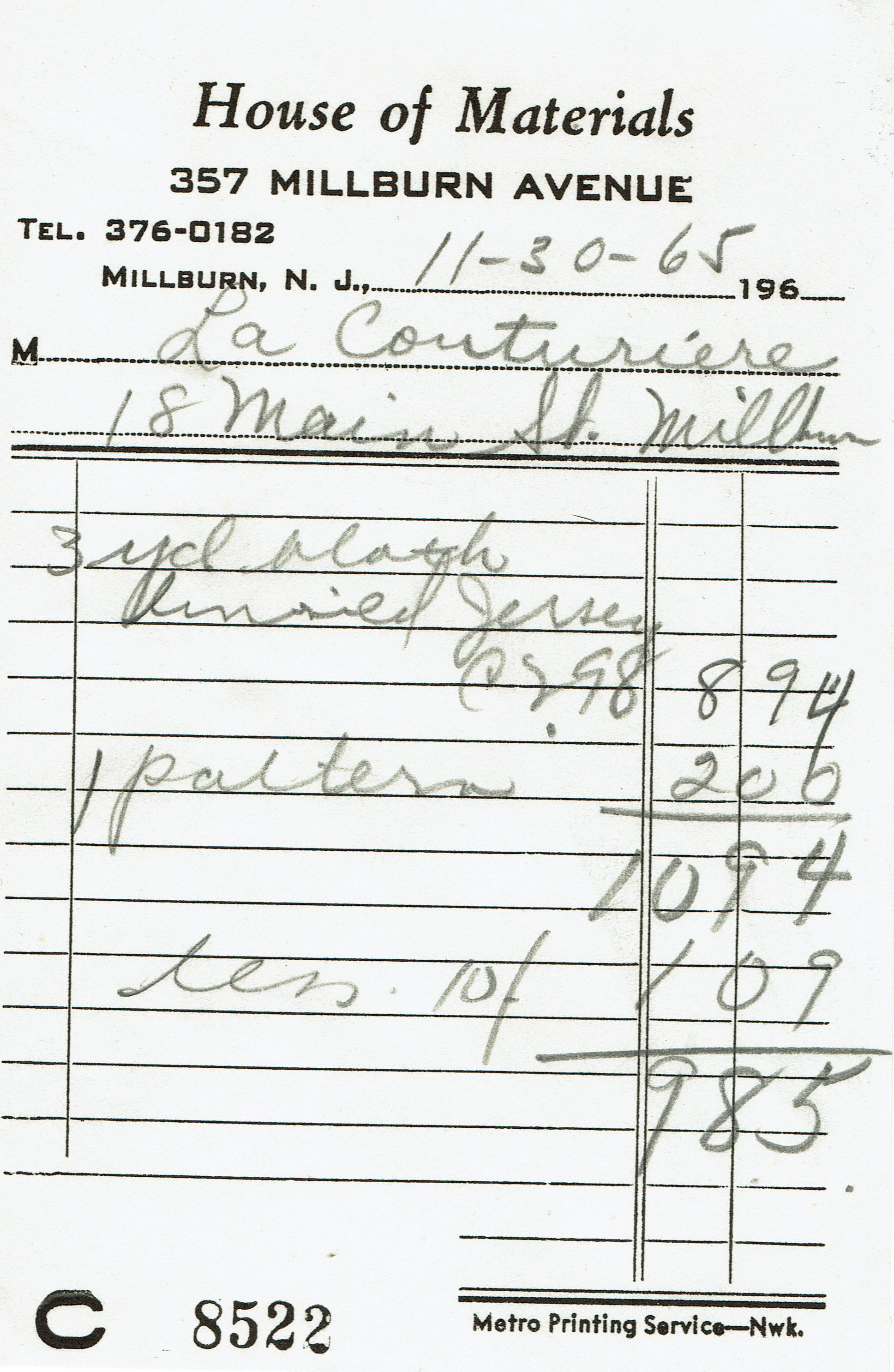 Three receipts from the House of Materials, 357 Millburn Avenue dating from 1957-1965. The 1965 receipt was for fabric for the women's store La Couturiere, 18 Main Street, Millburn.Acquisition